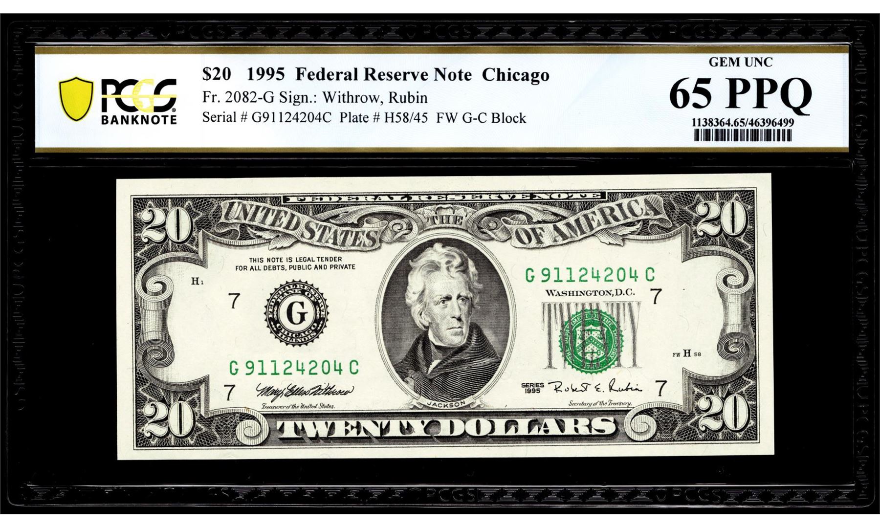 One 1995 $20 Federal Reserve Note Chicago Fr.2082-G PCGS Gem Unci 65PPQ. PCGS Graded.