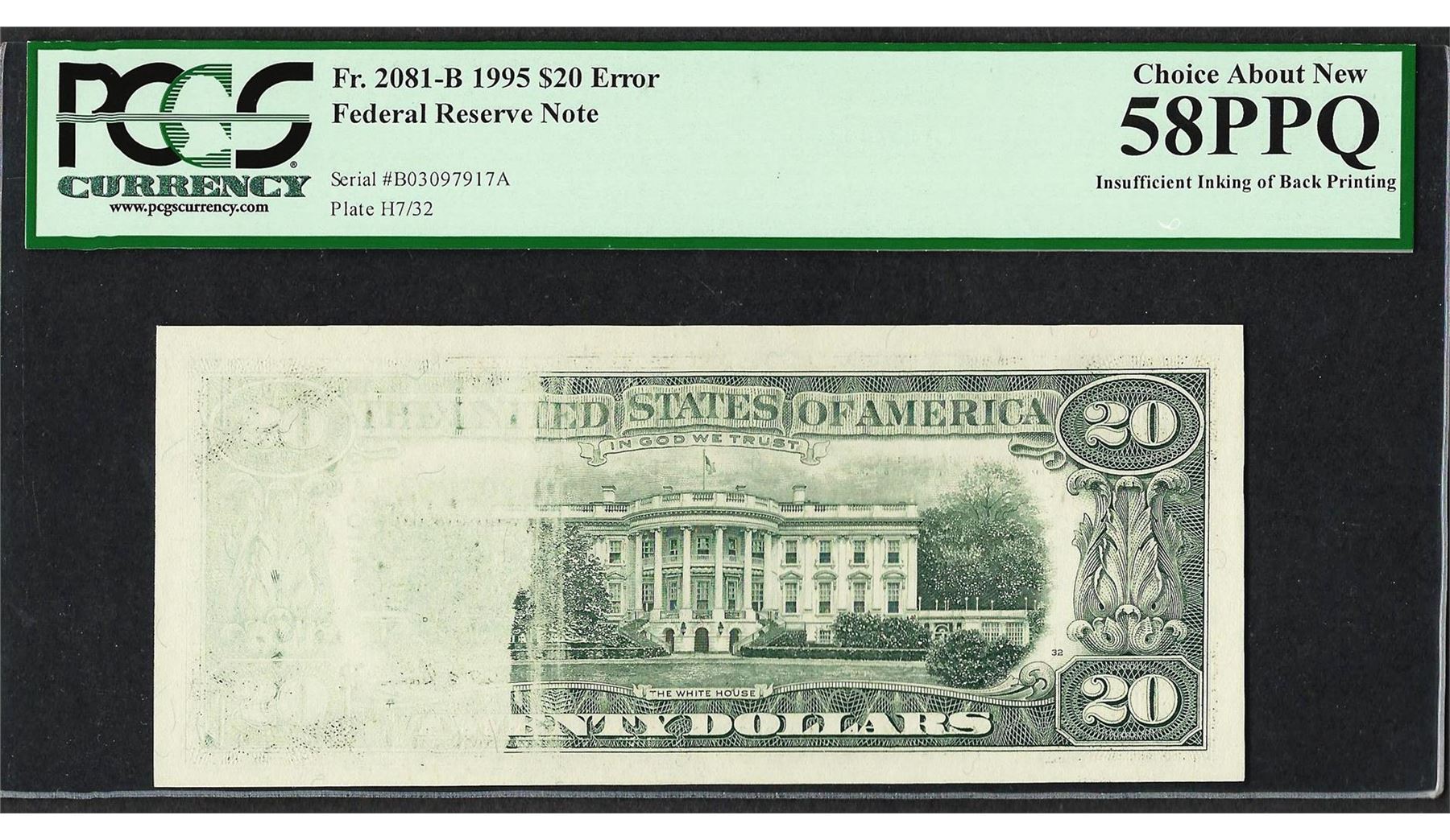 One 1995 $20 Federal Reserve Note ERROR Insufficient Inking PCGS Choice About New 58PPQ. PCGS Graded.