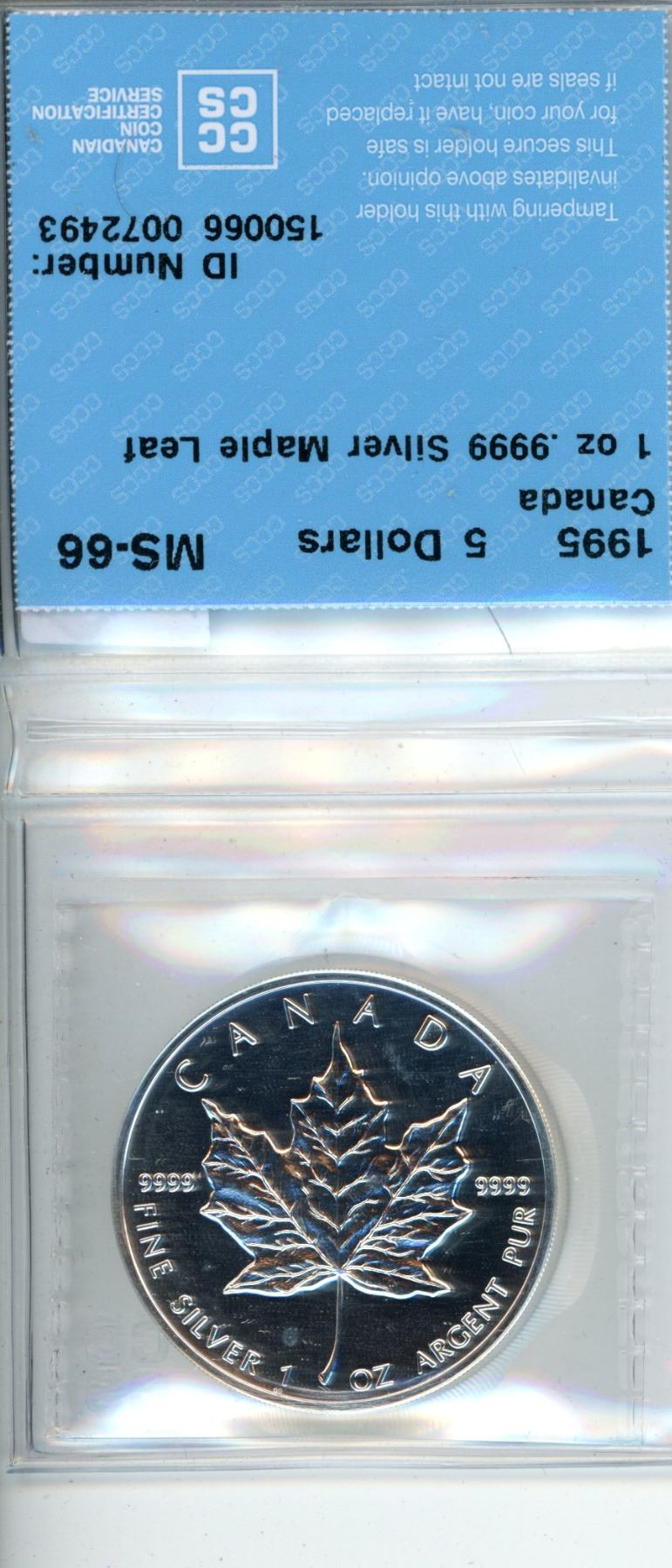 1995 $5 Canadian Dollar MS-66 1 Oz. .9999 Silver Maple Leaf CCCS Graded