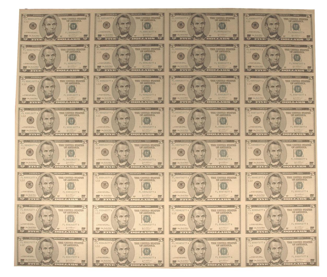 1995 $5 Federal Reserve Notes -- Uncut Sheet of 32 Notes -- Atlanta -- Withrow-Rubin -- Mint Condition
