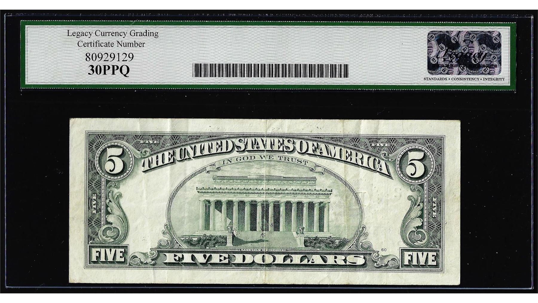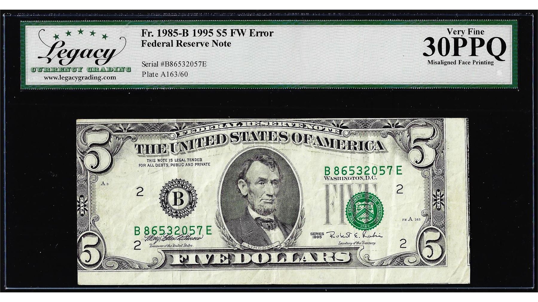 One 1995 $5 Federal Reserve Misaligned Face Printing Error Note Legacy Very Fine 30PPQ. Legacy Graded.