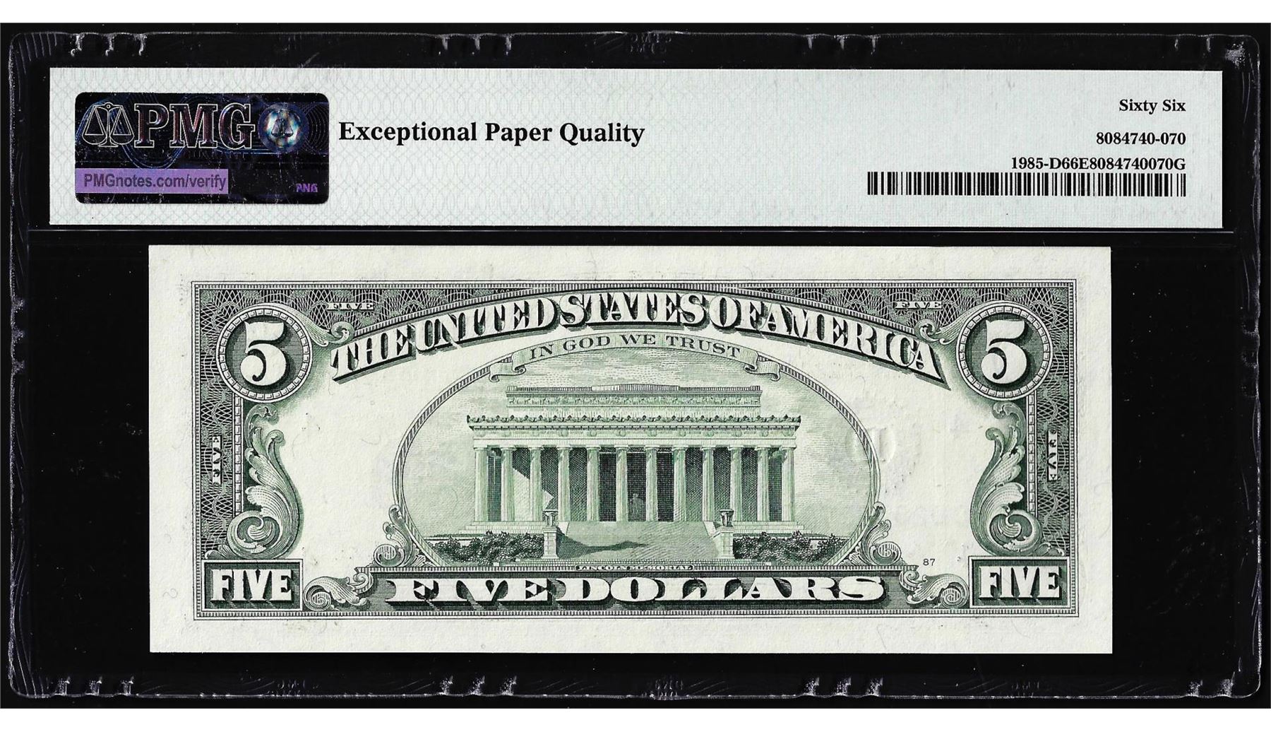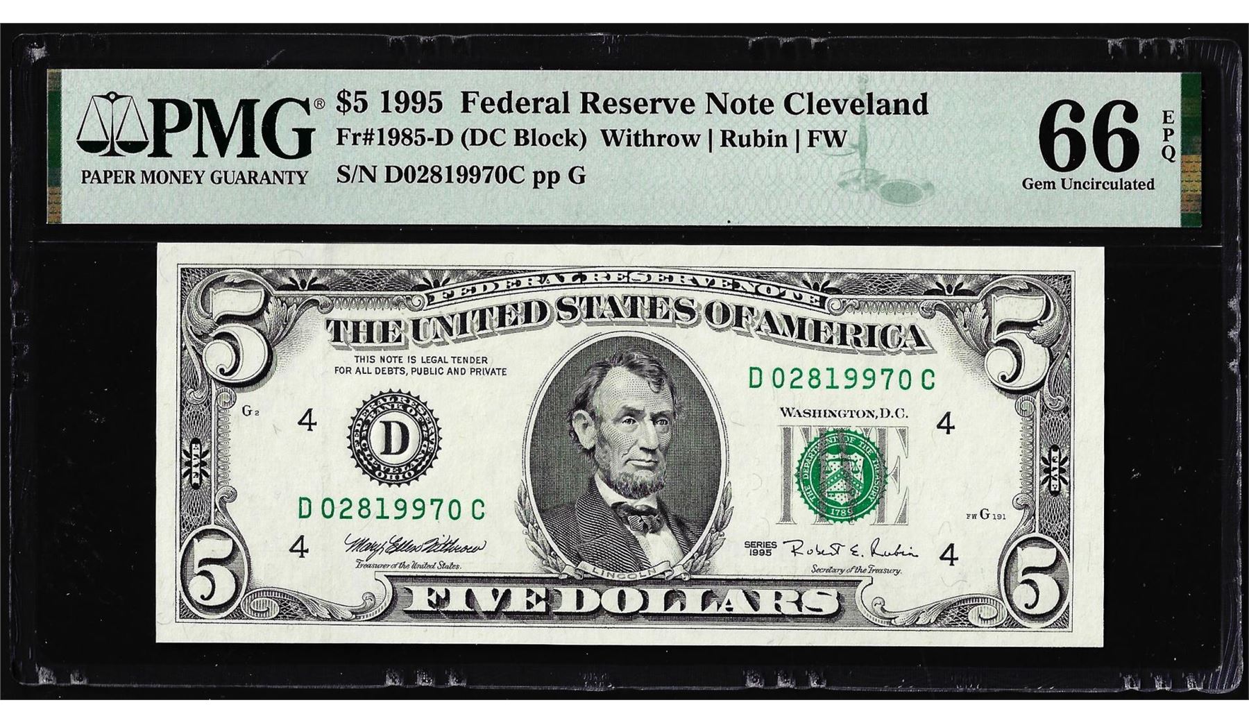 1995 $5 Federal Reserve Note Cleveland Fr.1985-D PMG Gem Uncirculated 66EPQ
