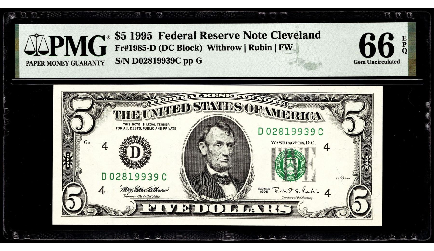 1995 $5 Federal Reserve Note Cleveland Fr.1985-D PMG Gem Uncirculated 66EPQ