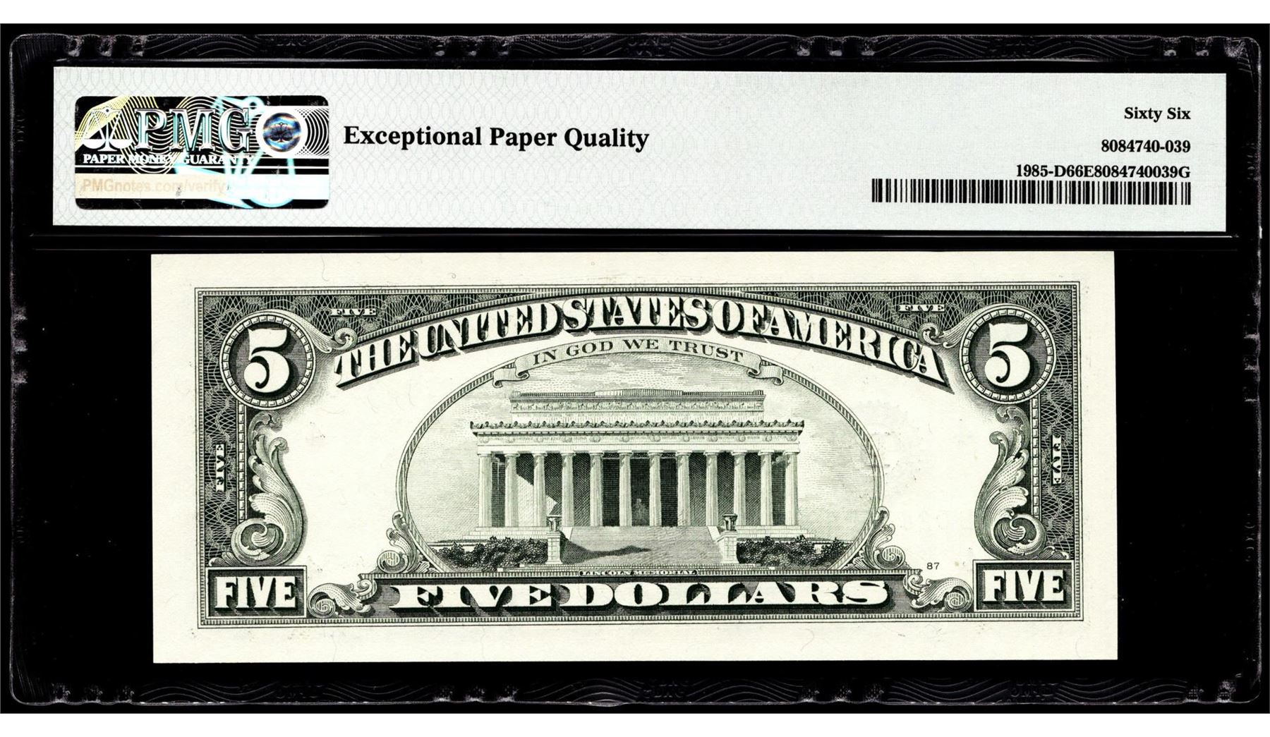 One 1995 $5 Federal Reserve Note Cleveland Fr.1985-D PMG Gem Uncirculated 66EPQ. PMG Certified.