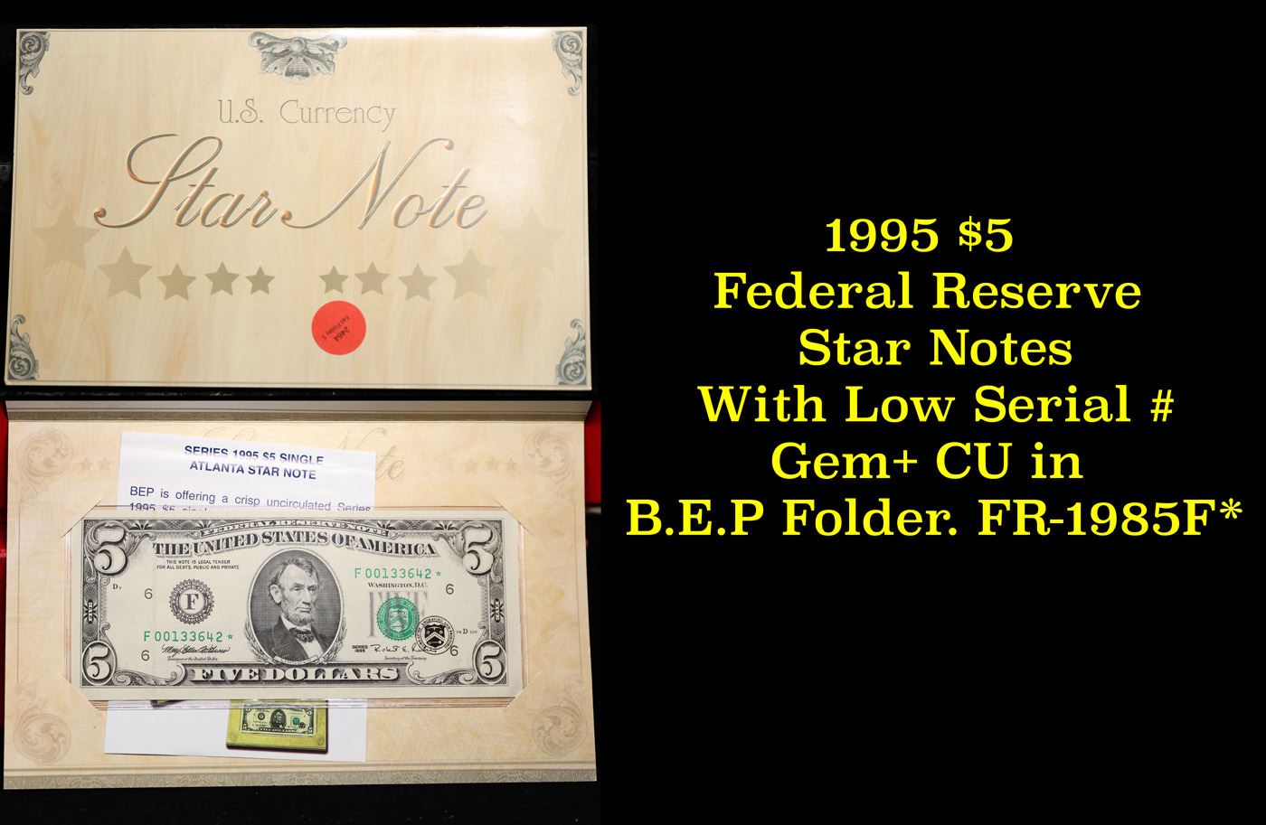1995 $5 Federal Reserve Star Notes With Low Serials Gem+ CU in B.E.P Folder. FR-1985F*