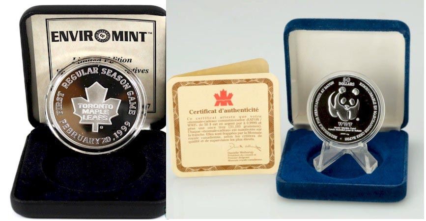 1995 $50 Timothy Eaton WWF & 1999 Limited Edition Toronto Maple Leafs Opening Day at Air Canada Centre 1oz. Lot of 2 Pure Silve