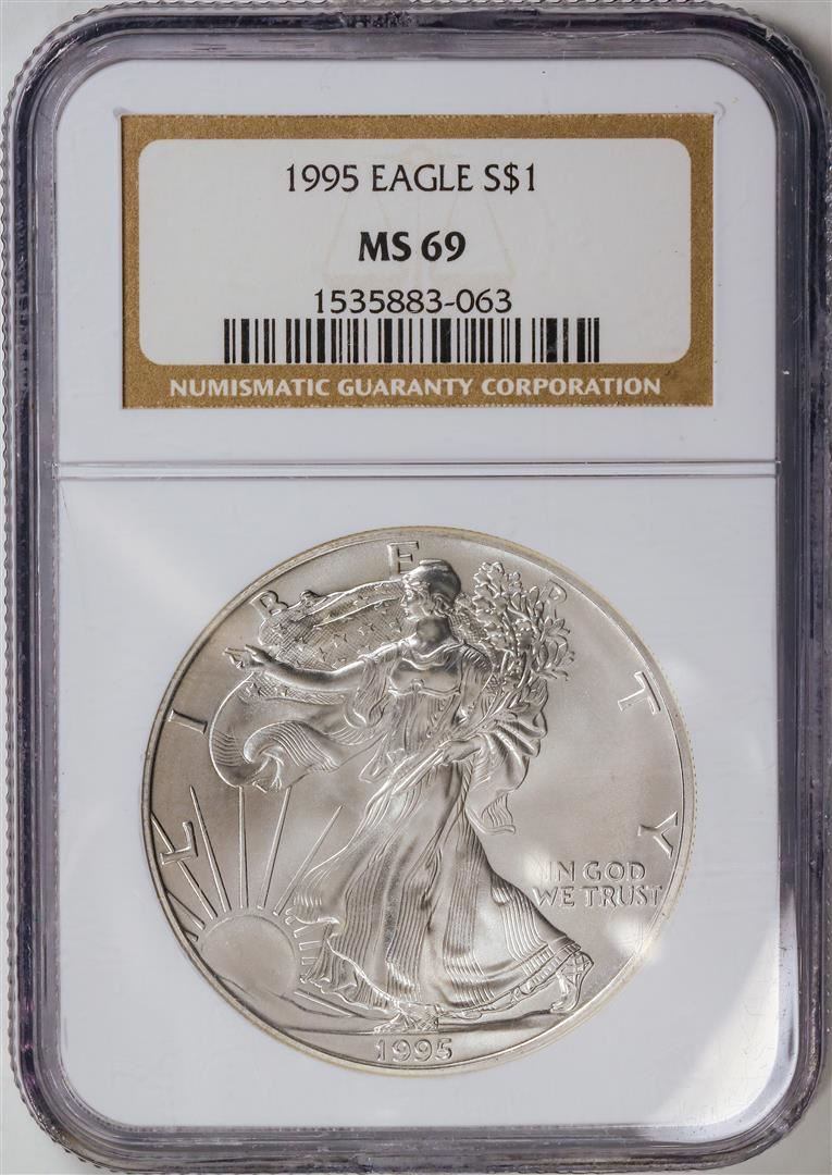 One 1995 American Silver Eagle .999 Fine Silver Dollar Coin NGC MS69.