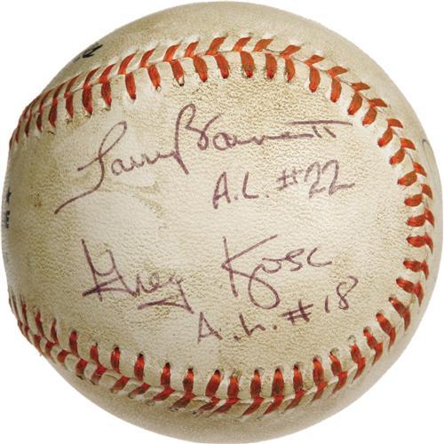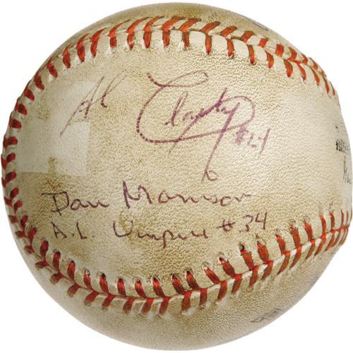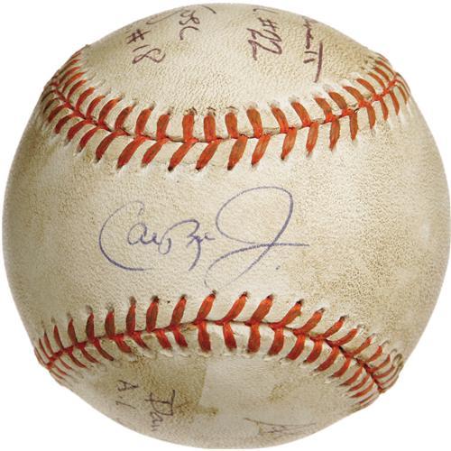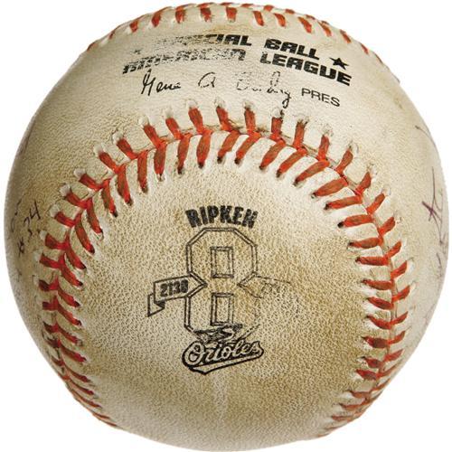 <B>1995 Cal Ripken, Jr. 2,131st Consecutive Game Used Baseball.</B></I> The Iron Man tops the Iron Horse. Well-used OAL (Budig) sphere with special Ripken stamping saw action on September 6, 1995 as the 2007 Hall of Fame inductee officially became the most dependable employee in Major League Baseball history. Ripken's 10/10 blue ink signature adorns the sweet spot, with the signatures of all four umpires working the game signing the side panels. Ball is accompanied by a letter from one of those umps, Dan Morrison, attesting to its historic heritage. An inspiring piece that links two of baseball's most honorable men. <I>LOA from PSA/DNA. LOA from James Spence Authentication.</B></I><BR><BR><b>Shipping:</b> Balls, Pucks, etc., Small (<a target="_blank" href="http://www.heritageauctions.com/common/shipping.php">view shipping information</a>)