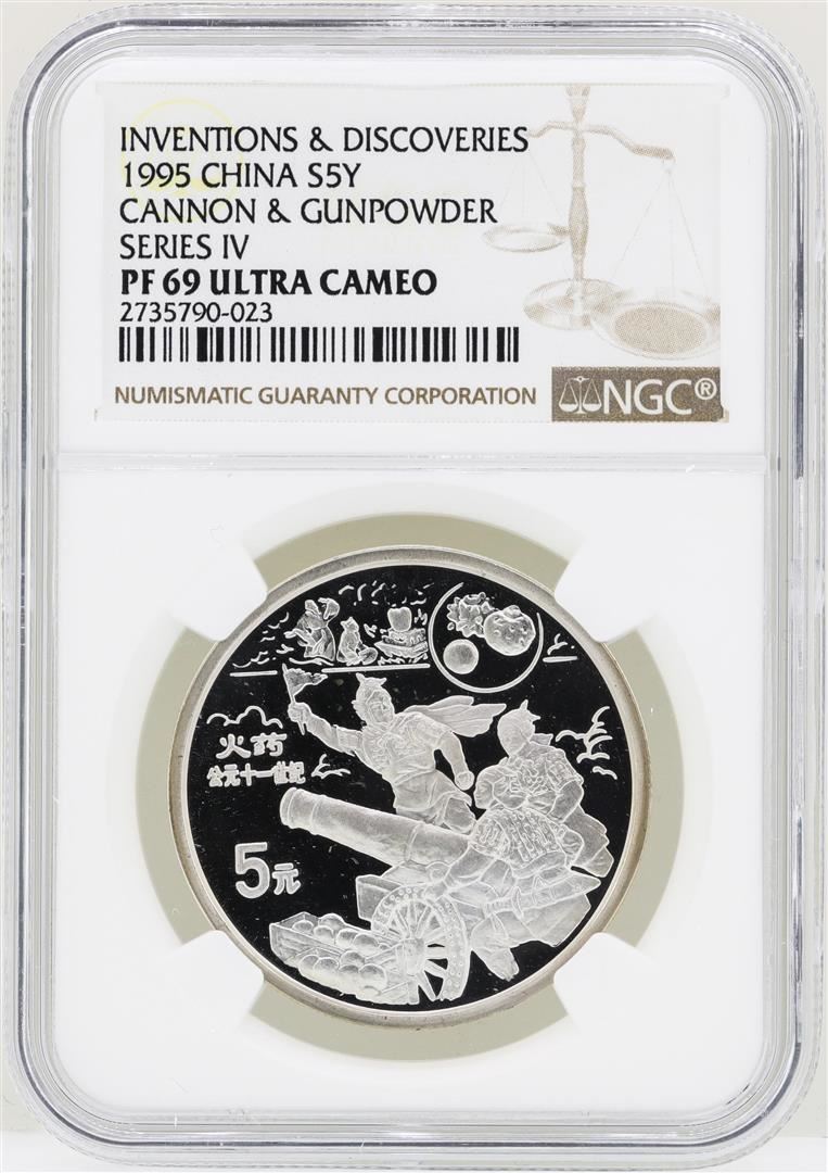 One 1995 China 5 Yuan Cannon & Gunpowder Silver Coin NGC PF69 Ultra Cameo. NGC Certified.