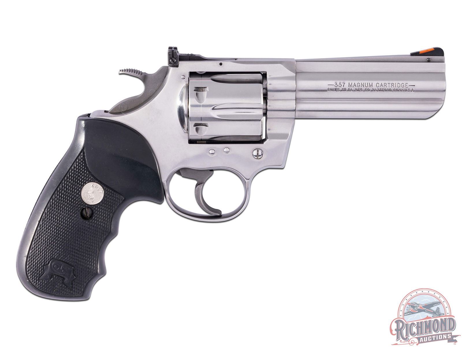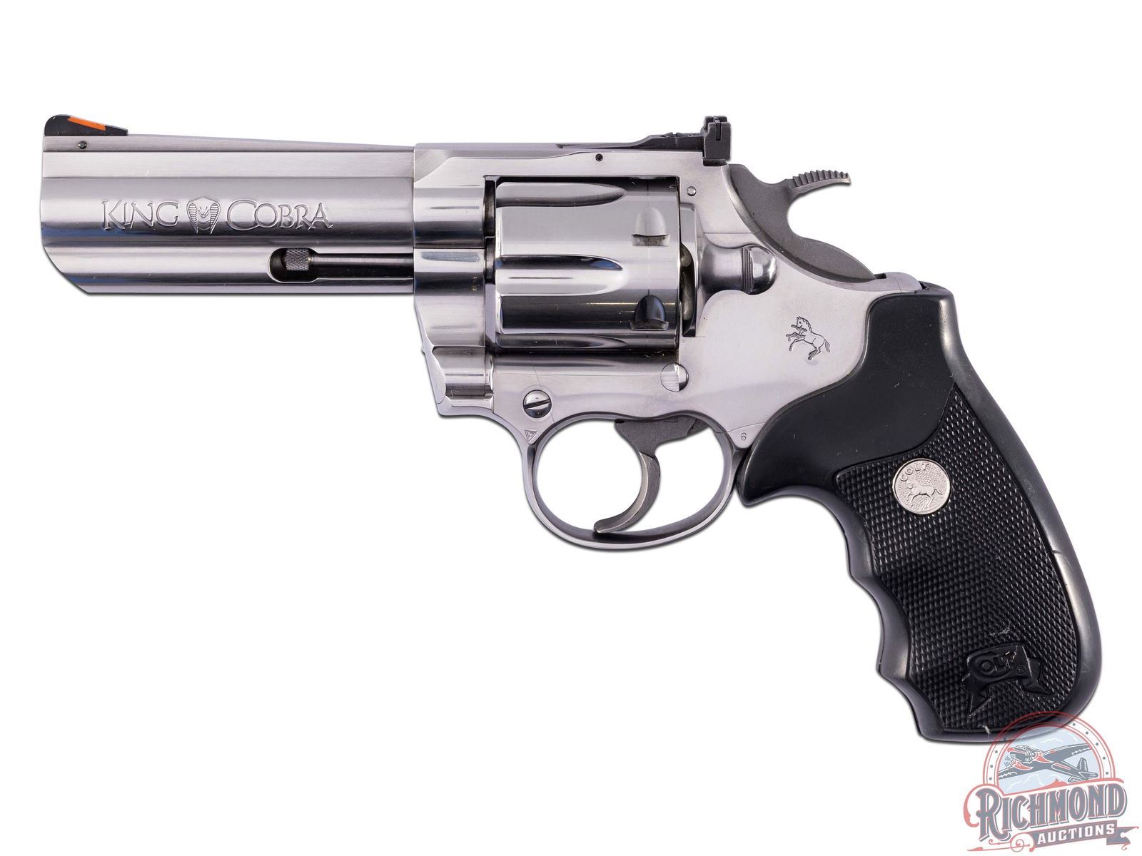 Manufactured in 1995. This beautiful snake gun features a 4" barrel with the enhanced recessed muzzle and full length shroud. Rear white outlined adjustable notch sight and orange highlighted front ramp. Left side of the barrel is stamped "KING COBRA" with cobra image. Left side of the frame is stamped with the Rampant Colt logo closer to the grip. Polished stainless steel finish. Six round fluted, swing-out cylinder chambered for 357 Magnum cartridges. Fitted with factory Colt checkered, finger grooved rubber grips with silver tone Colt medallions. Includes a King Ranch leather and vinyl soft case. CALIBER: 357 MAG. S/N: KE9422. FFL STATUS: Modern.