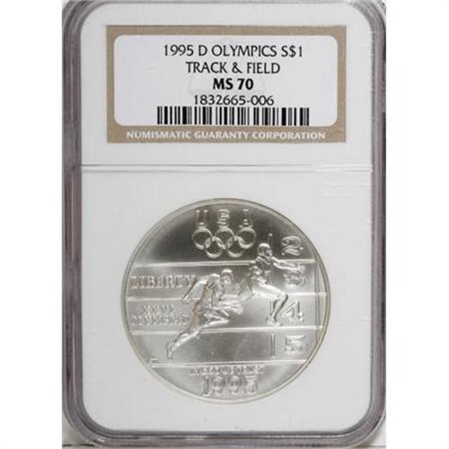 <B>1995-D $1 Olympic/Track & Field Silver Dollar MS70 NGC.</B></I> NGC Census: (150/0). PCGS Population (30/0). Numismedia Wsl. Price for NGC/PCGS coin in MS70: $360. (#9720)<BR><BR><b>Shipping:</b> Coins & Currency (<a target="_blank" href="http://www.heritageauctions.com/common/shipping.php">view shipping information</a>)