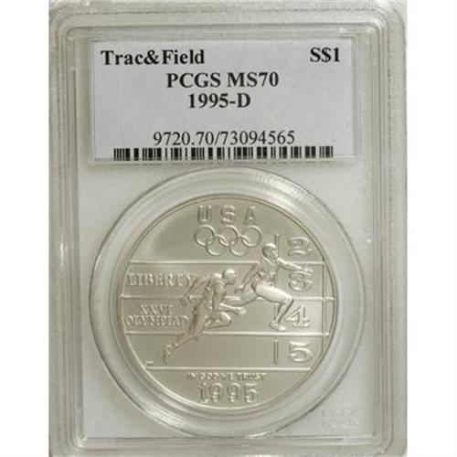 <B>1995-D $1 Olympic/Track & Field Silver Dollar MS70 PCGS.</B></I> PCGS Population (30/0). NGC Census: (150/0). Numismedia Wsl. Price for NGC/PCGS coin in MS70: $360. (#9720)<BR><BR><b>Shipping:</b> Coins & Currency (<a target="_blank" href="http://www.heritageauctions.com/common/shipping.php">view shipping information</a>)