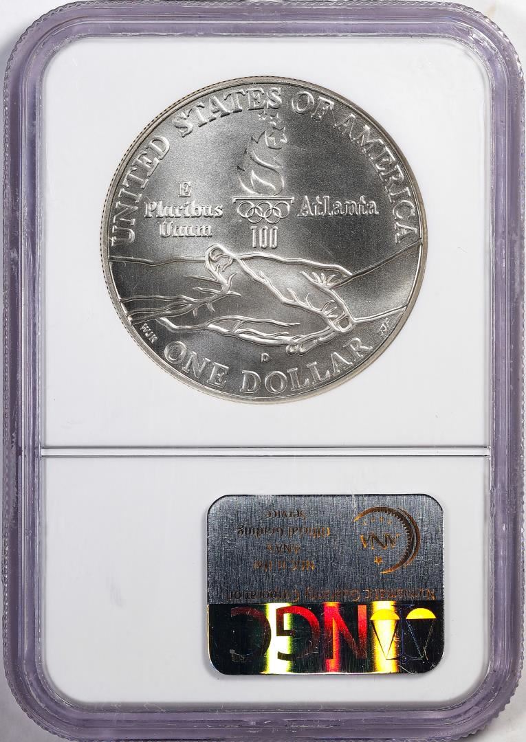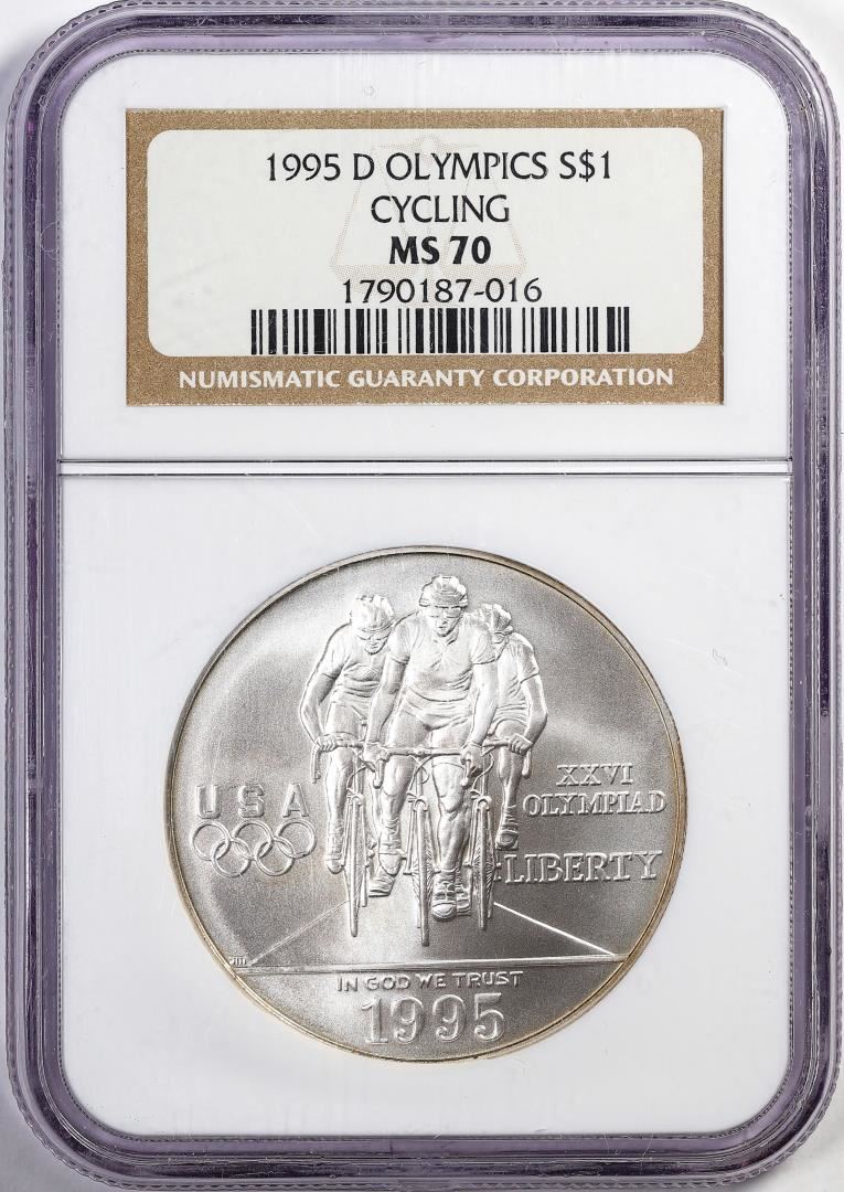 One 1995-D $1 Olympics Cycling Commemorative Silver Dollar Coin NGC MS70. NGC Certified.