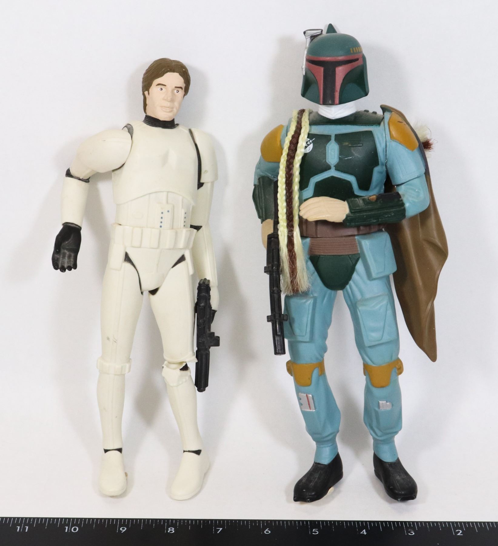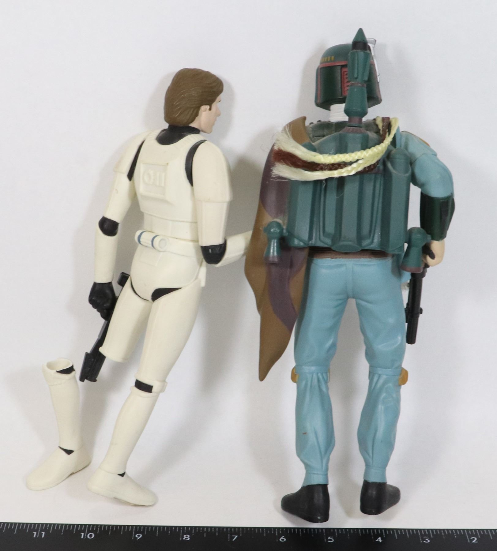 BOBBA FETT ACTION FIGURE. HAN NEEDS A LEG REPAIR, BOBBA FETT HAS SOMETHING GLUED TO SHOULDER. FEET NEED CLEANING