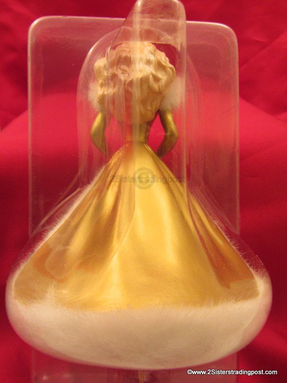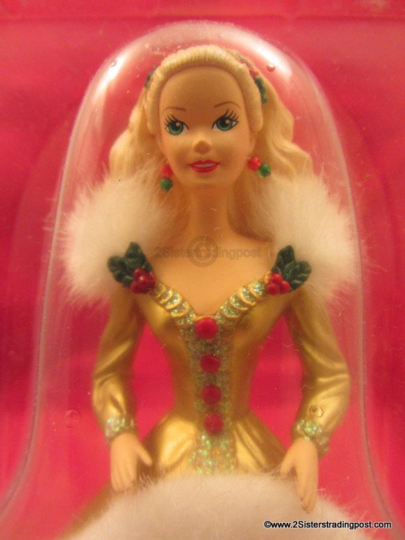 dressed in gold trimmed in white fur and accented with holly berries she is wearing matching