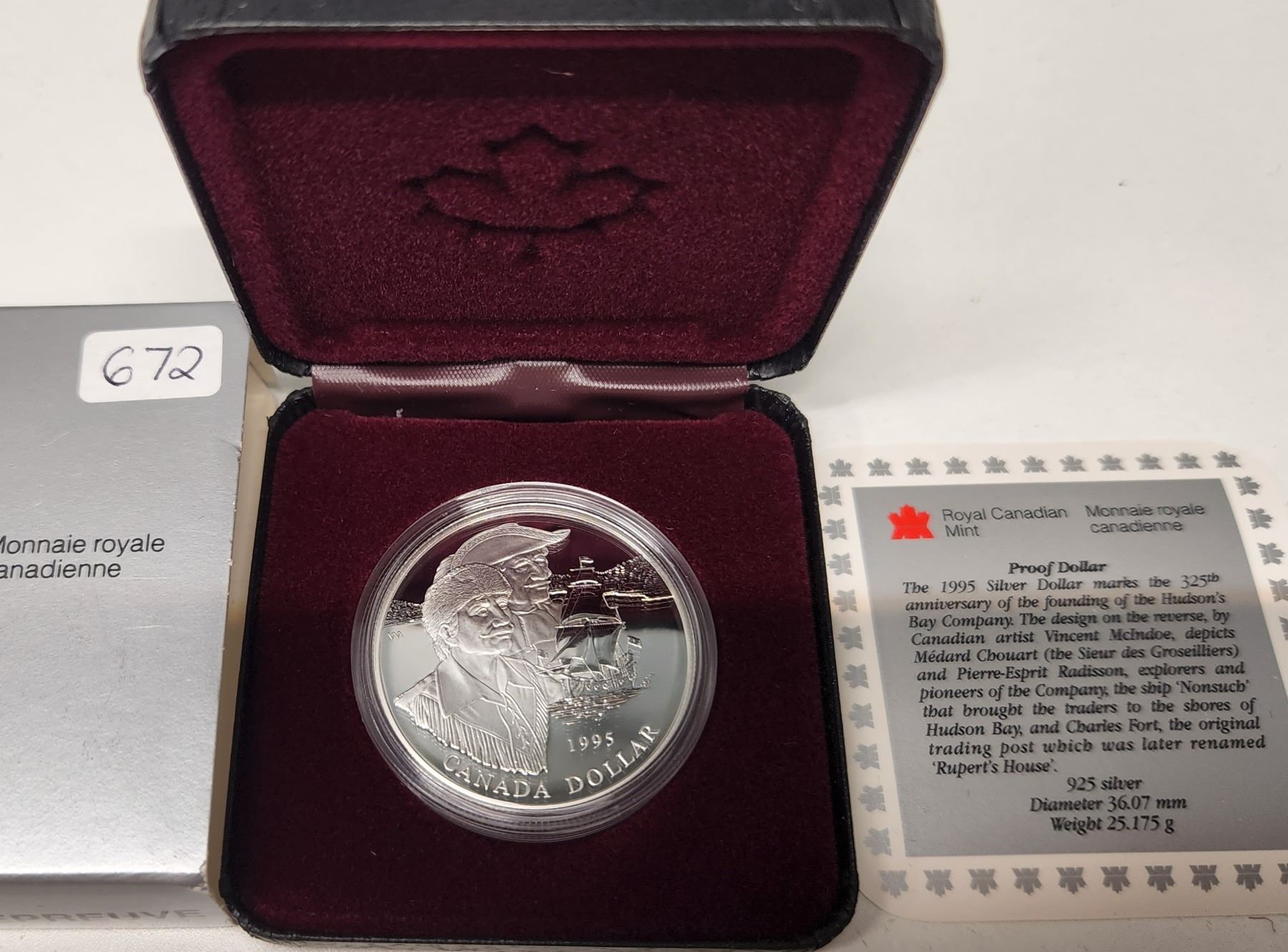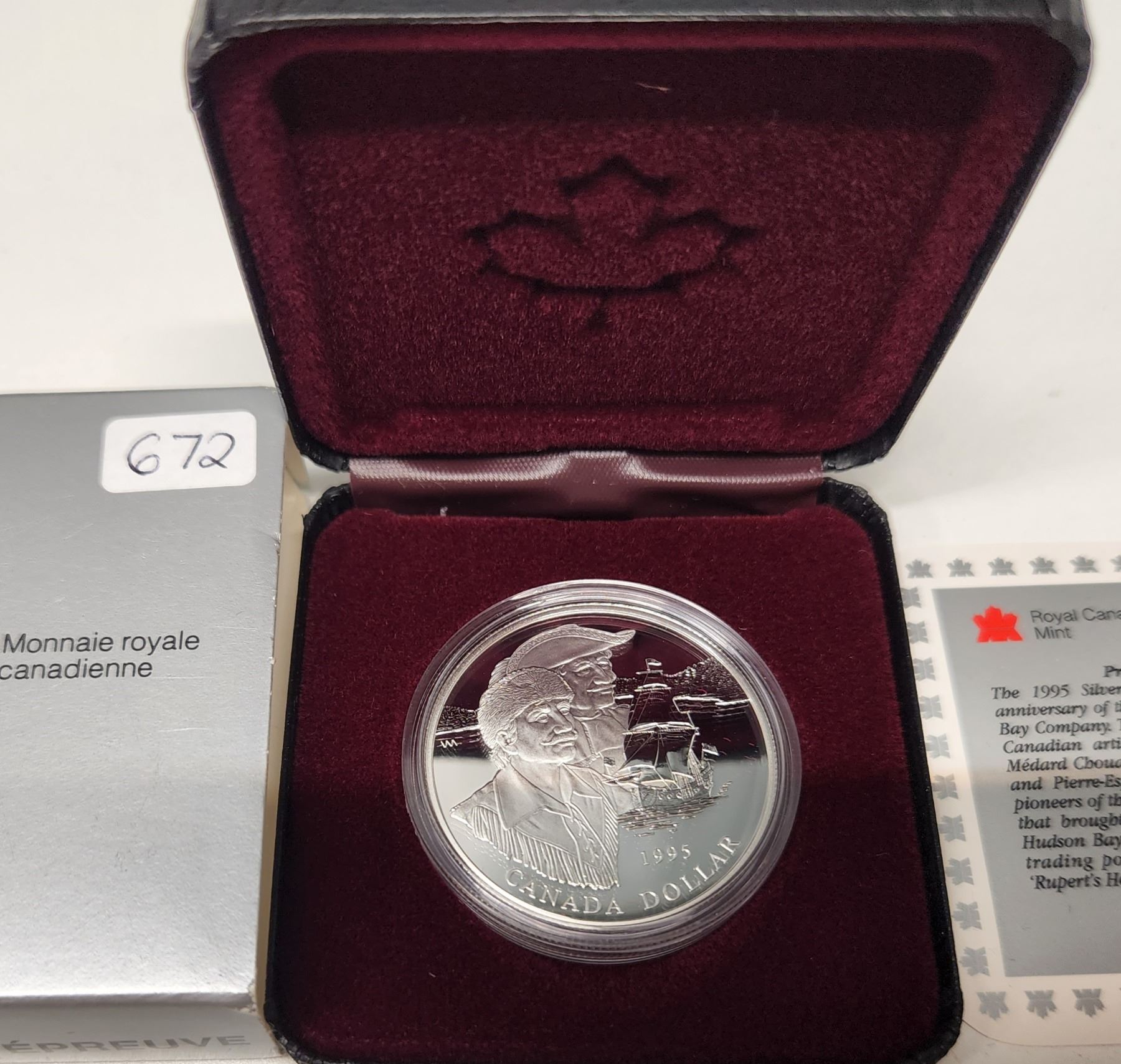 1995 Hudson’s Bay Company Proof Silver Dollar. Commemorates the 325th Anniversary of the founding of the HBC in 1670. Sterling Silver. Bright White with Ultra Heavy Cameo. In case and box of issue.