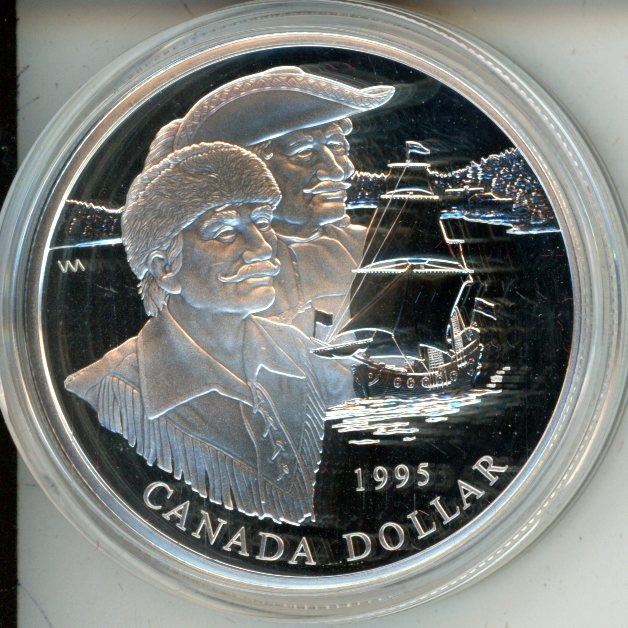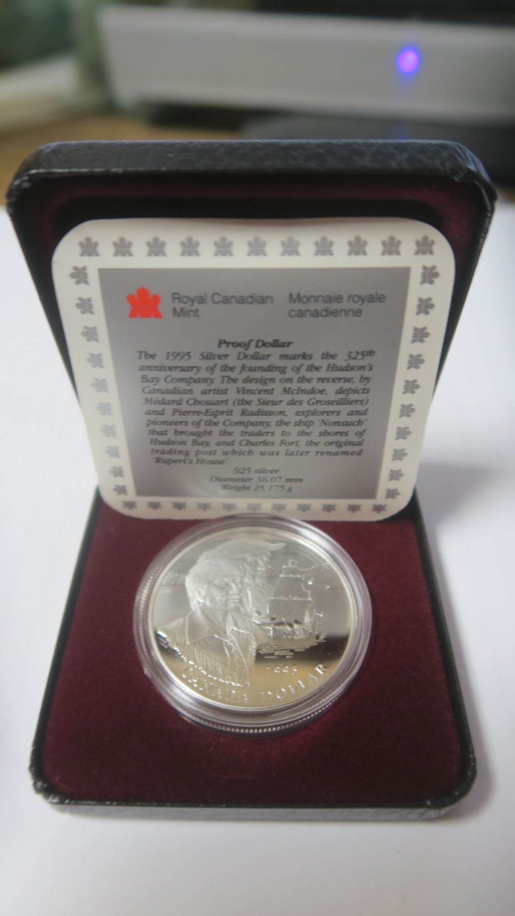 1995 Hudson’s Bay Company Proof Silver Dollar. Commemorates the 325th Anniversary of the founding of this famous fur trading company. Housed in its original case & box of issue.