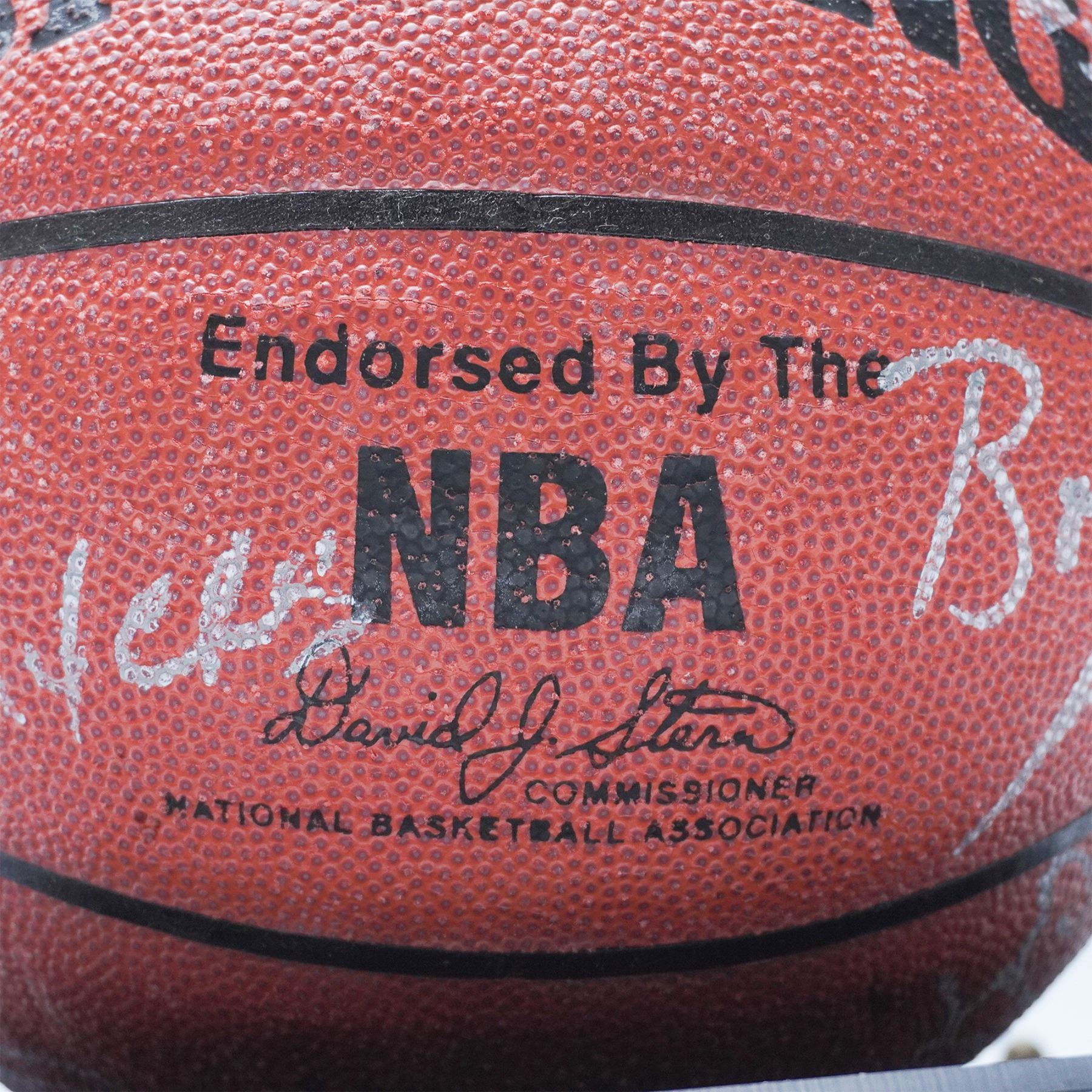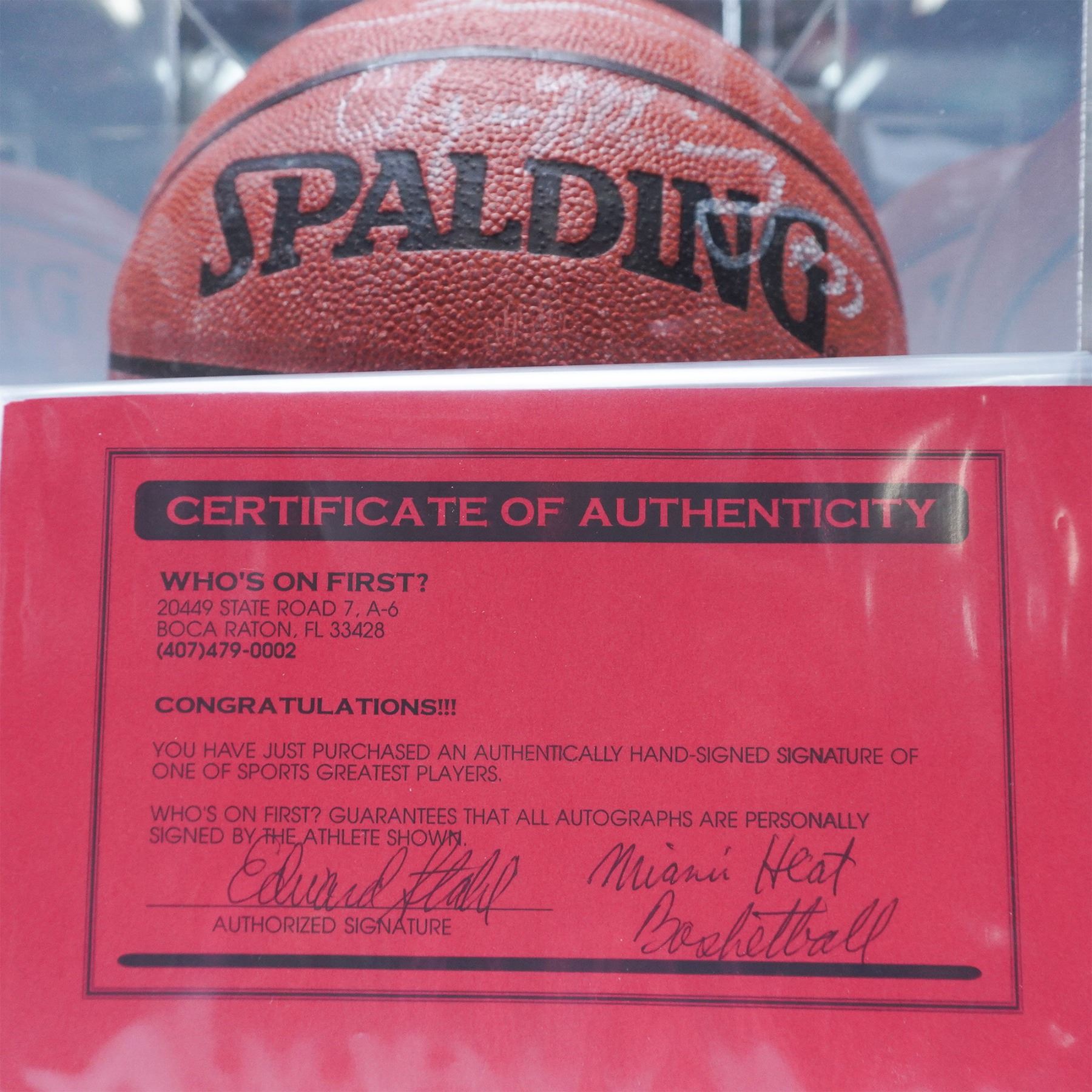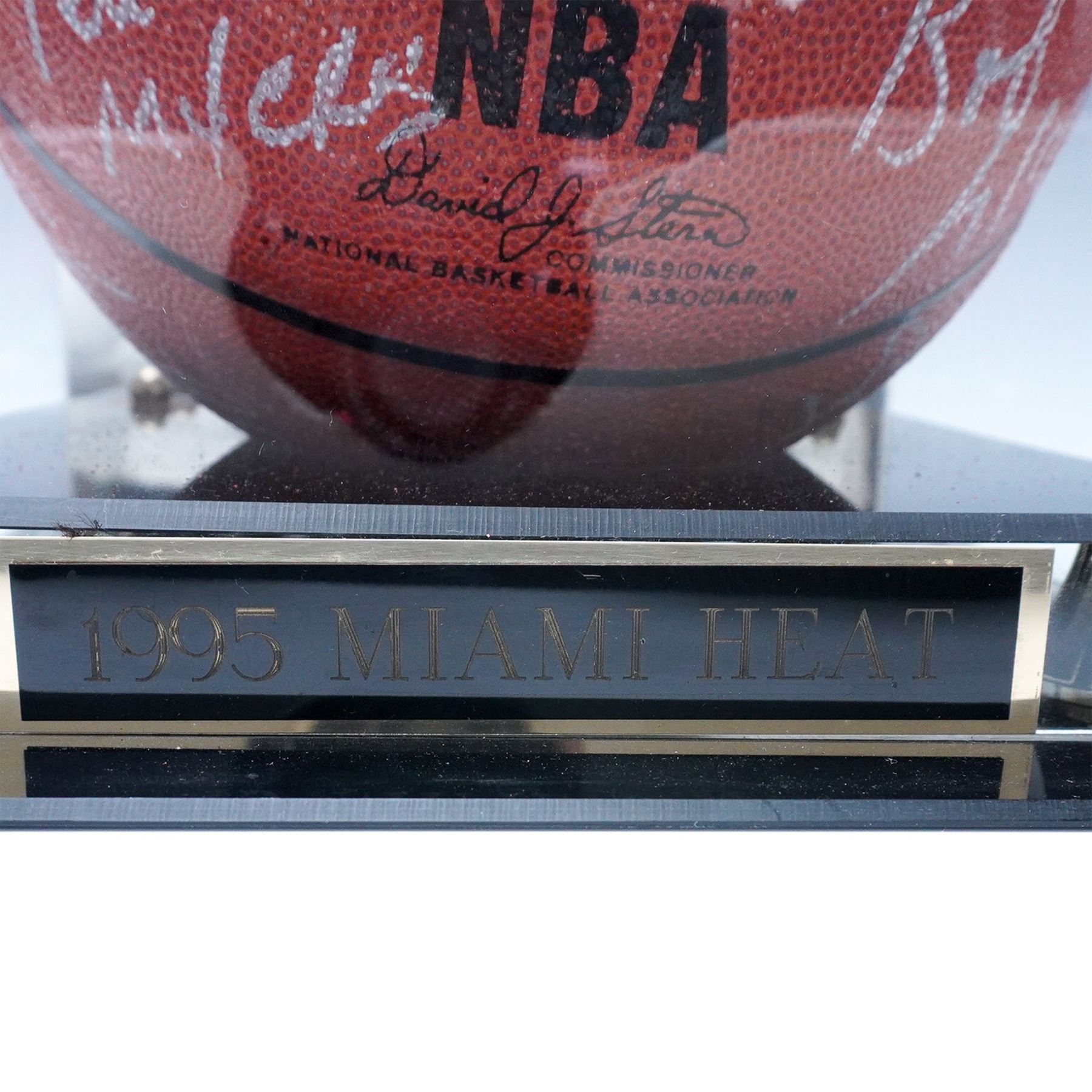 A rare and highly collectible 1995 Miami Heat team-signed Spalding NBA basketball, featuring autographs from key players of the era, including Pete Myers, Kurt Thomas, Billy Owens, and Terrence Rencher. This ball represents an exciting period in Heat history, capturing the team’s dynamic roster as they built toward future success. The autographs are signed in silver ink and showcase the talent that shaped the franchise during the mid-1990s. The basketball is elegantly displayed in a custom acrylic display case with a black base and gold-tone accents, featuring an engraved plaque reading "1995 MIAMI HEAT." Accompanied by a Certificate of Authenticity (COA) from Who's On First?. An exceptional piece of NBA memorabilia, perfect for Miami Heat fans, sports collectors, and basketball enthusiasts.