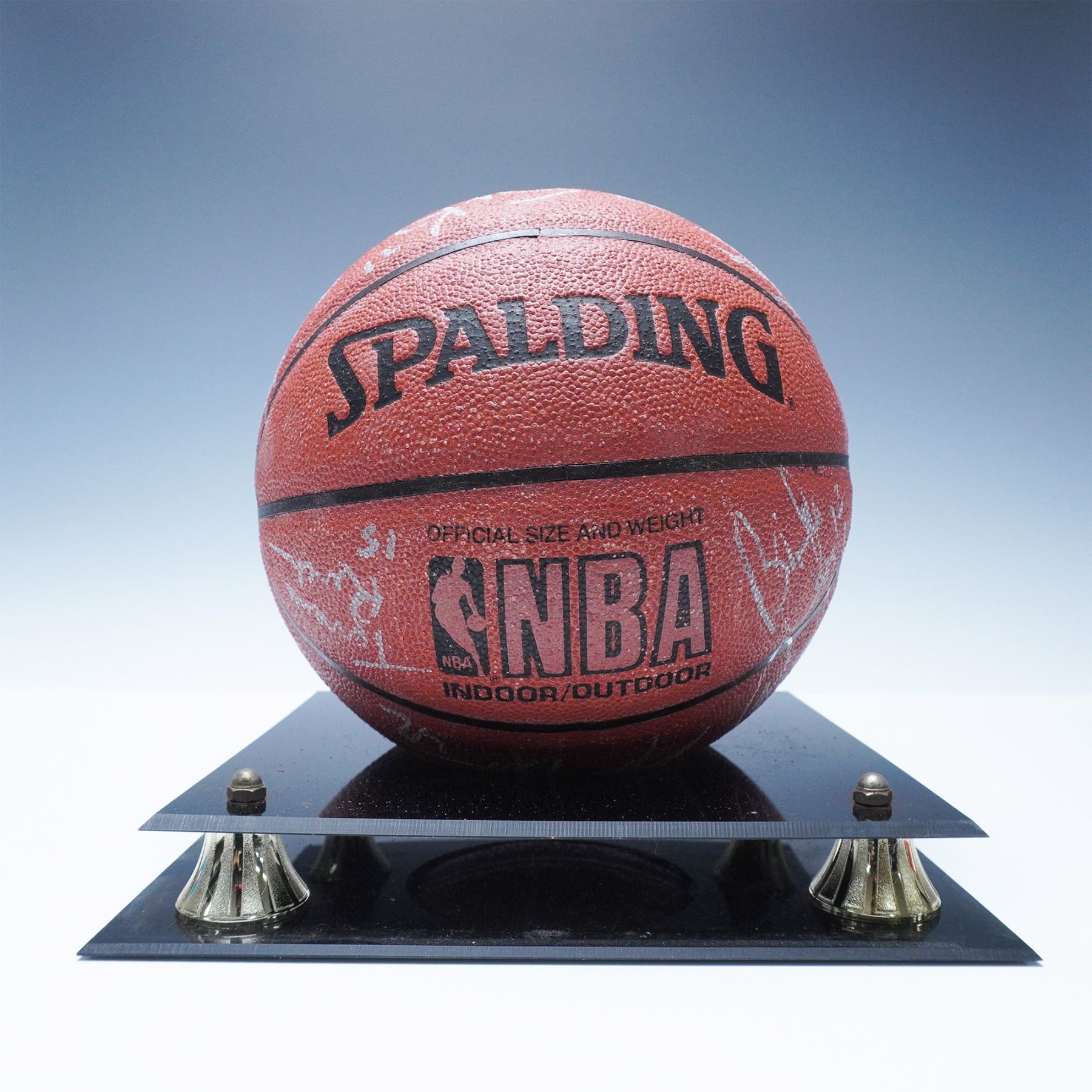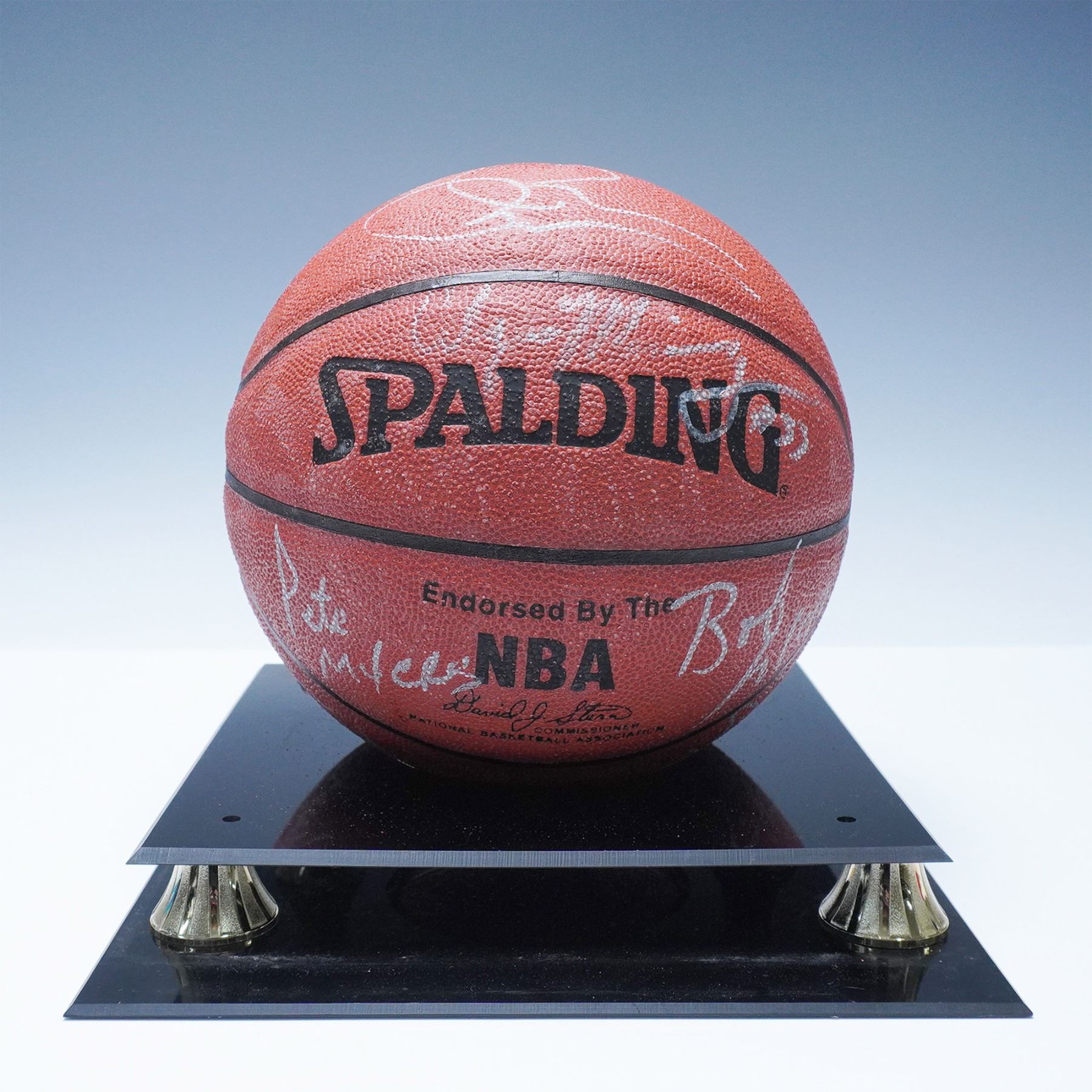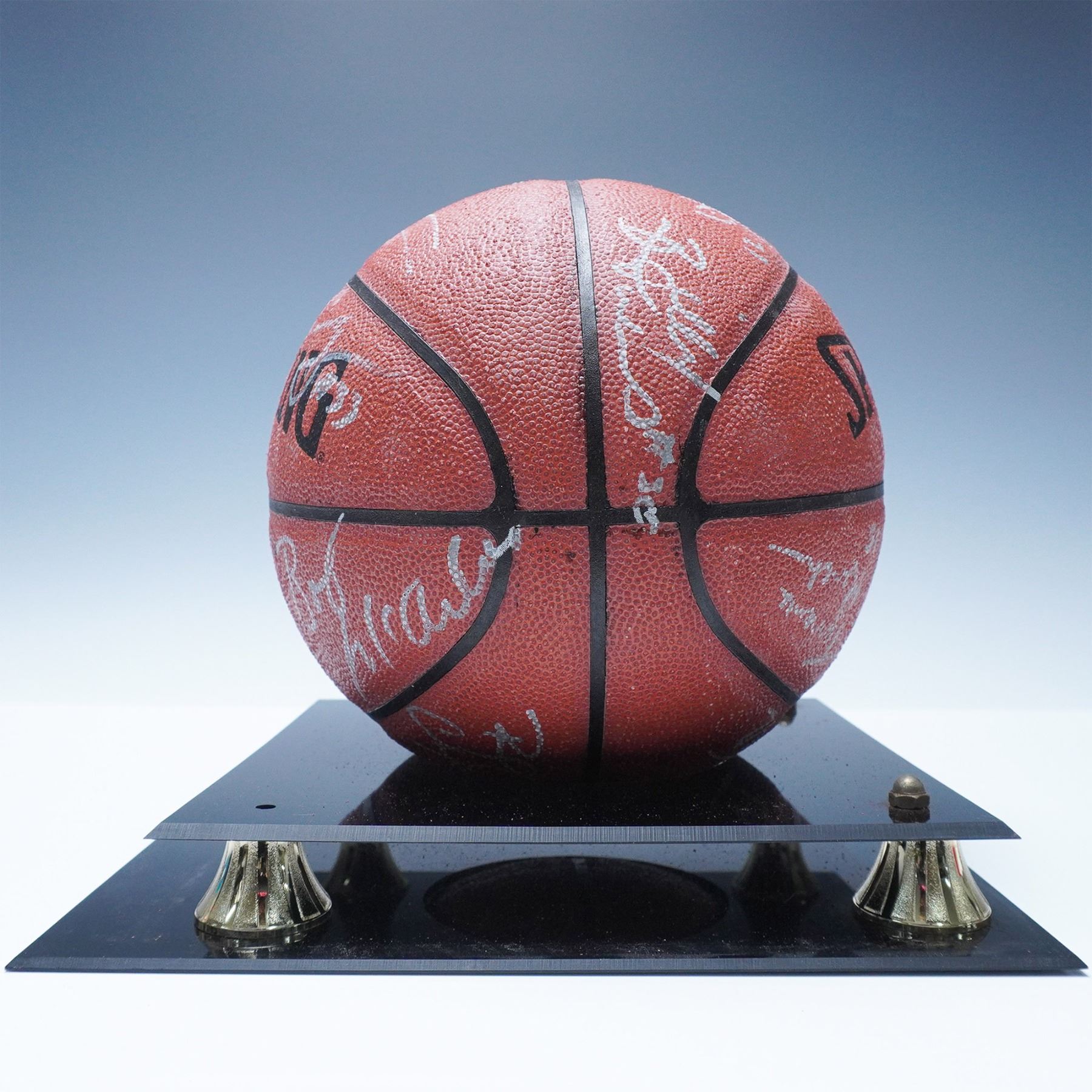 A rare and highly collectible 1995 Miami Heat team-signed Spalding NBA basketball, featuring autographs from key players of the era, including Pete Myers, Kurt Thomas, Billy Owens, and Terrence Rencher. This ball represents an exciting period in Heat history, capturing the team’s dynamic roster as they built toward future success. The autographs are signed in silver ink and showcase the talent that shaped the franchise during the mid-1990s. The basketball is elegantly displayed in a custom acrylic display case with a black base and gold-tone accents, featuring an engraved plaque reading "1995 MIAMI HEAT." Accompanied by a Certificate of Authenticity (COA) from Who's On First?. An exceptional piece of NBA memorabilia, perfect for Miami Heat fans, sports collectors, and basketball enthusiasts.