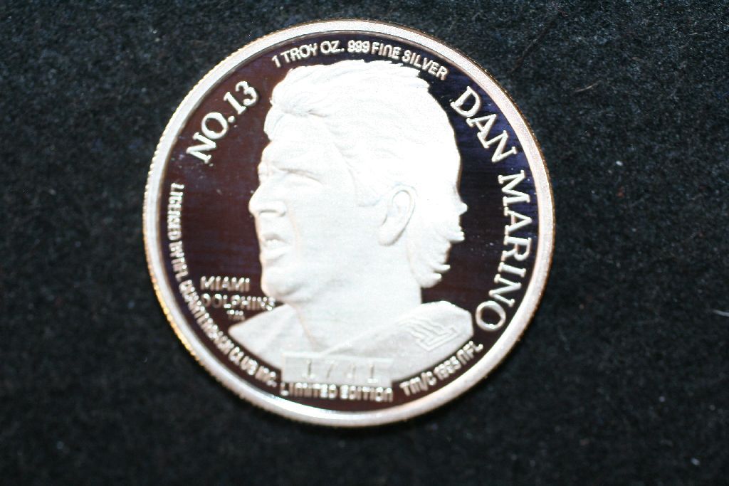 1995 NFL First Player in NFL History to Reach 50,000 Passing Yards Limited Edition Silver Round; #13 Miami Dolphins Dan Marino; .999 Fine Silver 1 Oz.; COA Included