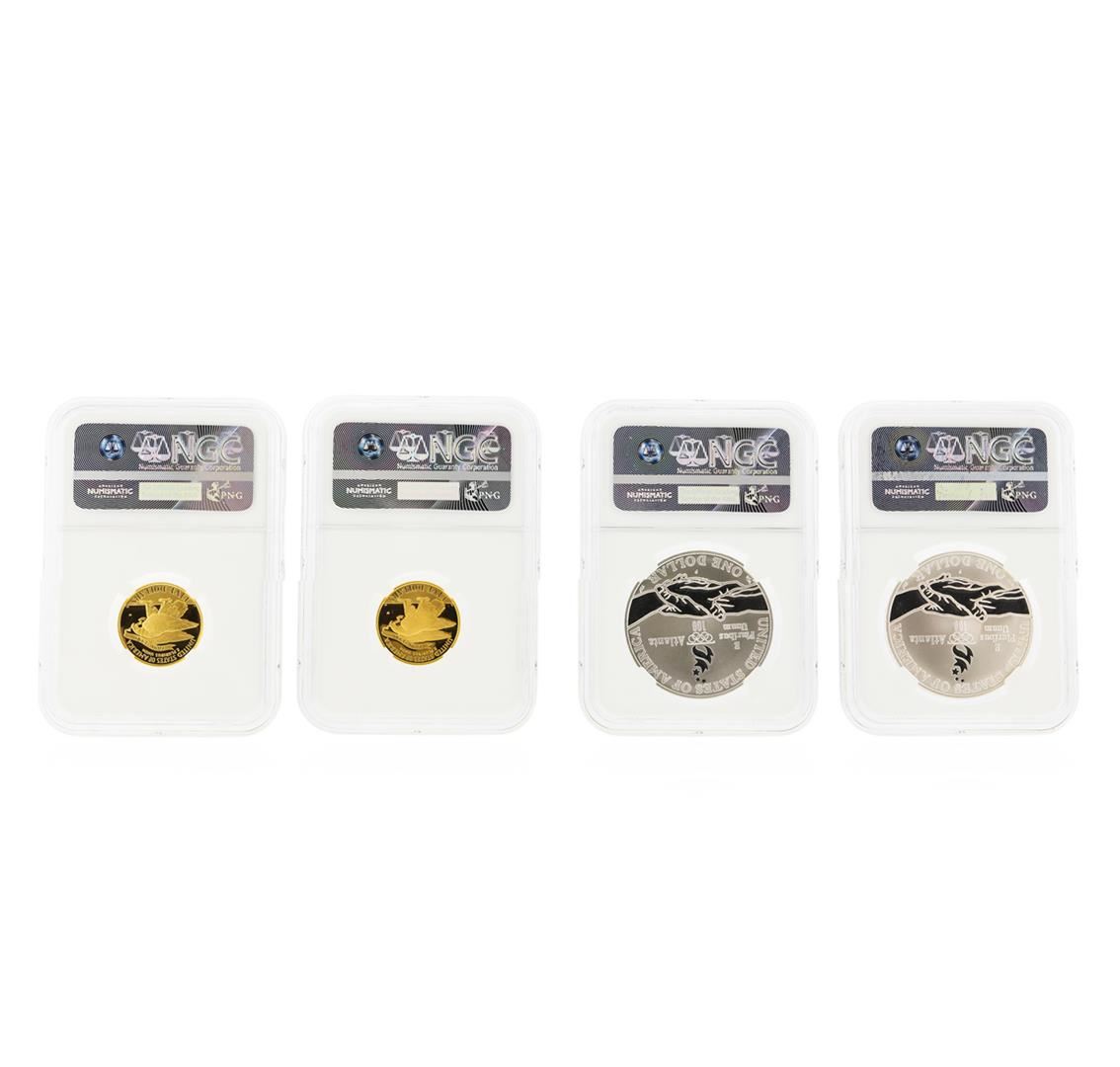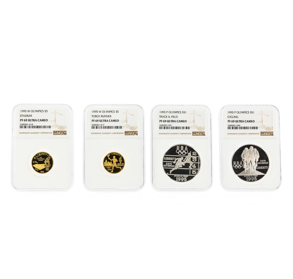 This set includes the following coins: 1995-W Olympics Stadium $5 Gold Coin, 1995-W Olympics Torch Runner $5 Gold Coin, 1995-P Olympics Track & Field $1 Silver Coin, and 1995-P Olympics Cycling $1 Silver Coin. All coins are NGC Graded PF69 Ultra Cameo. NGC Certified.