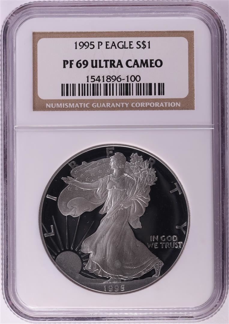 One 1995-P $1 Proof American Silver Eagle Coin NGC PF69 Ultra Cameo. NGC Certified.