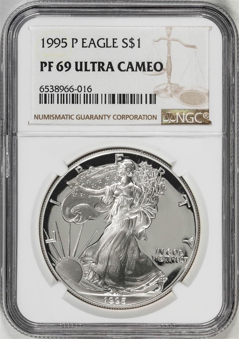 One 1995-P $1 Proof American Silver Eagle Coin NGC PF69 Ultra Cameo. NGC Certified.