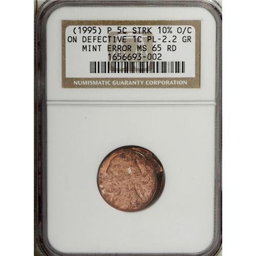 <B>1995-P 5C Jefferson Nickel--Struck 10% Off-Center on a Defective Cent Planchet--MS65 Red NGC.</B></I> A complicated error to say the least! A ragged, underweight (2.2 grams) cent planchet was fed into a nickel press, and this reddish-orange piece, struck 10% off-center toward 8 o'clock, was the result.<BR><BR><b>Shipping:</b> Coins & Currency (<a target="_blank" href="http://www.heritageauctions.com/common/shipping.php">view shipping information</a>)