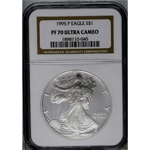 <B>1995-P<img border='0' src='http://www.heritagecoins.com/images/star.gif' width=10 height=10>$1> Silver Eagle PR70 Ultra Cameo NGC.</B></I> Stunning and abundant mint frost throughout, and a thoroughly satisfying example of this date. <BR><BR><B>Important notice:</B> Heritage usually auctions material at the rate of 200-250 lots per hour. On some occasions eBay Live bid software or the Internet may not be able to keep up with the pace of the auction. We recommend placing a realistic absentee bid now as insurance to avoid disappointment. Occasionally the auctioneer may eliminate or reject an eBay Live bid, and the auctioneer may also reopen a lot after the close of the eBay live bidding (usually because we missed an audience bid), and may reject your bid even if it shows you as the winning bidder. By bidding via eBay Live, you agree that Heritage may award the lot to another bidder at its sole discretion under the circumstances described above or any other reasonable circumstances. Since eBay bids are not shown to us until we open the lot on the floor, we treat those bids just like floor bids. In most cases the floor responds before the eBay bid is presented to us, due to Internet lag time, so for consistency we have made it a policy that floor bids are always considered first over tie eBay live bids. Also please note that all Heritage lots purchased through eBay Live carry a 20% Buyer's Premium. Please make sure you read the Terms and Conditions before you bid. This lot is being auctioned in conjunction with a live floor auction by Heritage Galleries & Auctioneers. All final auction and invoice information will be supplied by Heritage Galleries & Auctioneers, and all other information should be considered preliminary. Lot:5208 <BR><BR><B>Winning Notification and Billing:</B> After the FINAL session in this auction is complete, Heritage will send e-mail and snail mail invoices. This process normally takes several days. All final auction and invoice information will be supplied by Heritage Galleries & Auctioneers, and all other information should be considered preliminary. <BR><BR>This auction will be conducted on a live auction floor and over the Internet through eBay Live. If you choose to place an absentee bid, please take a moment to <font color='#0000ff'><u><a href='http://pages.ebay.com/liveauctions/help/before/laabsentee.html'>learn how eBay Live absentee bidding works</a></u></font><font color='#000000'>