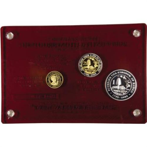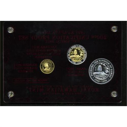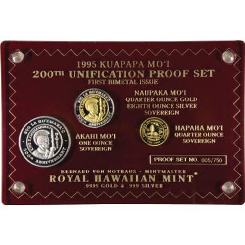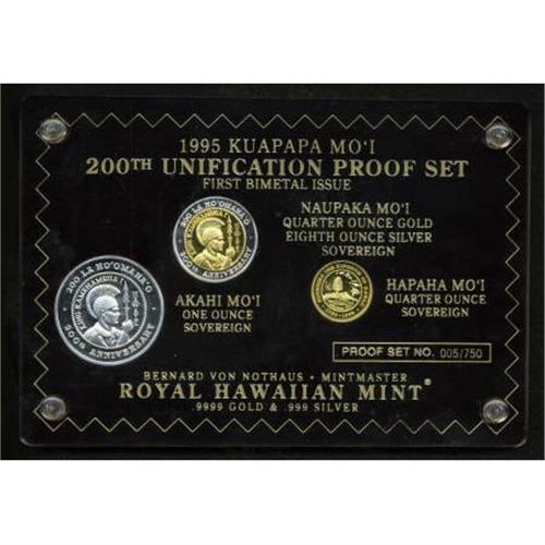 <B>1995 Royal Hawaiian Mint First Bimetallic Issue.</B></I> Gold/silver. Three-piece set of <B>proof</B></I> silver and gold issued by the Royal Hawaiian Mint for the 200th anniversary of the Bicentennial of the Kingdom of Hawaii 1795-1995. The pieces come in 1 oz .999 fine silver, 1/4 oz .999 fine gold, and 1/8 oz .999 fine silver bimetallic piece. The set is housed in a red hard plastic holder and serial numbered 005/750, with outer case and box of issue.<BR><BR><b>Shipping:</b> Coins & Currency (<a target="_blank" href="http://www.heritageauctions.com/common/shipping.php">view shipping information</a>)