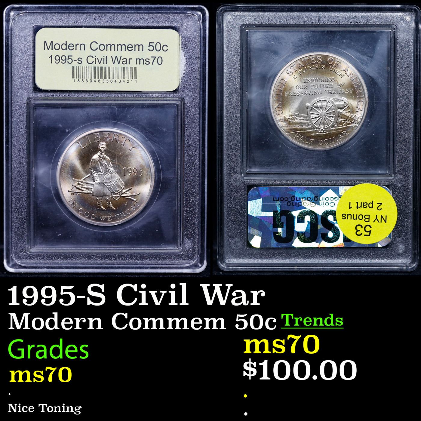 1995-S Civil War Modern Commem Half Dollar 50c Graded ms70, Perfection By USCG