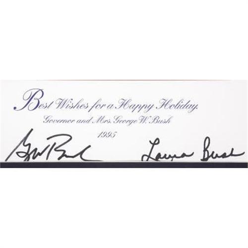 <B>1995 Large Texas Governor's Christmas Card Signed by George W. and Laura Bush.</B></I> It pictures a Texas flag flying from the Christmas-decorated balcony of the Texas Governor's Mansion. The printed caption on the lower margin reads "Best Wishes for a Happy Holiday. Governor and Mrs. George W. Bush 1995". It is signed boldly beneath by George and Laura Bush in black felt tip. The embossed seal of the Texas Governor is at the lower left. Sight size is 11.5" x 14.5"; it is matted and framed to an overall size of 17" x 20". Excellent condition. <I>From the personal collection of Sharon Bush and accompanied by a signed Letter of Authenticity from her</B></I>.<BR><BR><b>Shipping:</b> Framed - with Glass, Small (<a target="_blank" href="http://www.heritageauctions.com/common/shipping.php">view shipping information</a>)