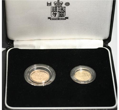 Two coin set, limited edition 22 carat gold proof United Kingdom half sovereign and 10 pound Britannia. Issued by the Royal Mint these two coins are the smallest and most exquisite gold coins of the realm. Encapsulate