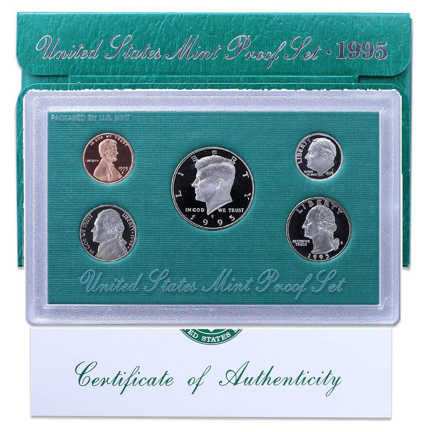 1995 United States Proof Set, 5 Coins Inside!. Original packaging: The coins of the 1995-S Proof Set were placed in individual holes in a green-colored, textured paper and cardboard insert, then sealed in a two-piece, clear plastic case. The case was then inserted, along with a Certificate of Authenticity, into a protective outer cover, consisting of green cardboard imprinted with the somewhat confusing silver words: "United States Mint Proof Set • 1995." The new collector might ask, "Is this a Mint Set or a Proof Set?"