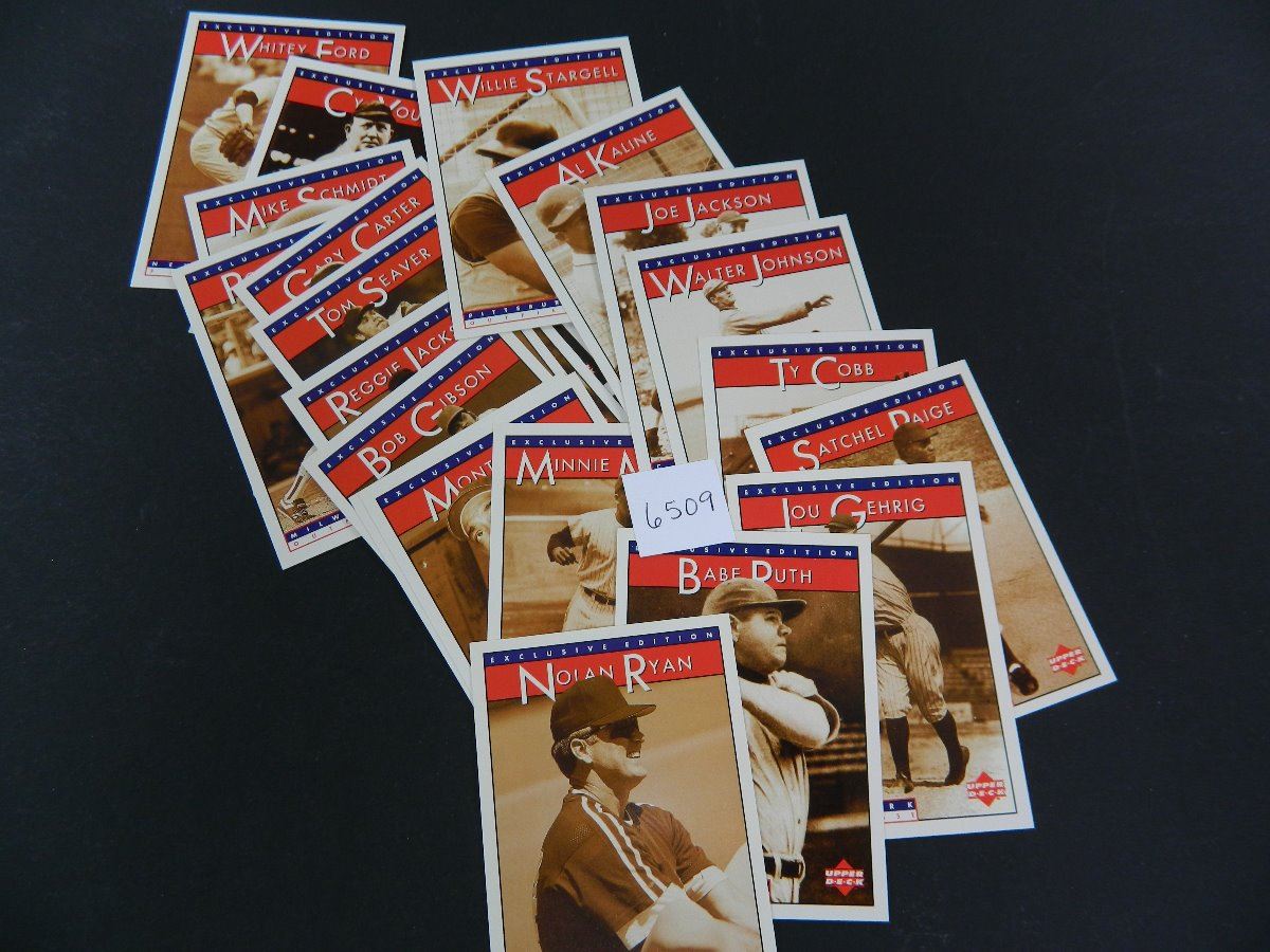 Incl: Babe Ruth, Nolan Ryan,Lou Gehrig, Satchel Paige,Ty Cobb, Walter Johnson, Shoeless Joe Jackson, Al Kaline, Stargell, Minosa, Monte Irvin, Gil Hodges, Bob Gibson, Reggie Jackson, Tom Seaver, Gary Carter, Robin Yount, Mike Schmidt, Cy Young & Whitey Ford. all one money, nice set!
