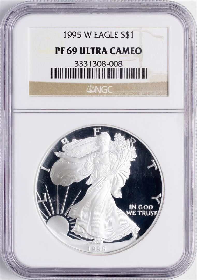One 1995-W $1 Proof American Silver Eagle Coin NGC PF69 Ultra Cameo. NGC Certified.