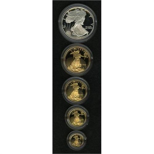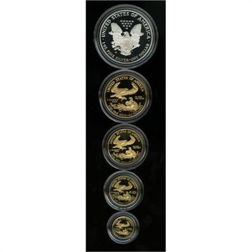 <B>10th Anniversary Set Proof Bullion Coins PR67 Cameo Uncertified.</B></I> All five pieces reside in the lovely red velvet presentation case and red cardboard box of mint issue with certificate of authenticity enclosed. The set includes: <B>1995-W One-Tenth Ounce Gold Eagle PR67 Cameo Uncertified; 1995-W One-Quarter Ounce Gold Eagle PR67 Cameo Uncertified; 1995-W One-Half Ounce Gold Eagle PR67 Cameo Uncertified; 1995-W One Ounce Gold Eagle PR67 Cameo Uncertified; and a 1995-W American Eagle Silver Dollar PR67 Deep Cameo Uncertified. </B></I><BR><BR><b>Shipping:</b> Coins & Currency (<a target="_blank" href="http://www.heritageauctions.com/common/shipping.php">view shipping information</a>)