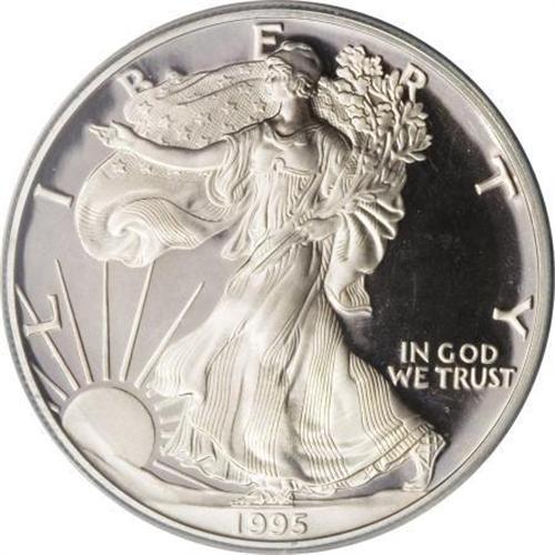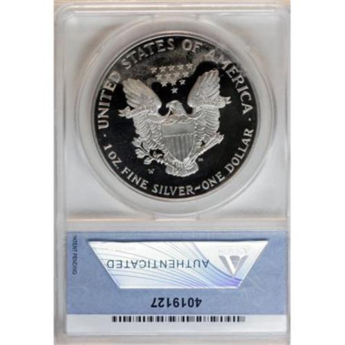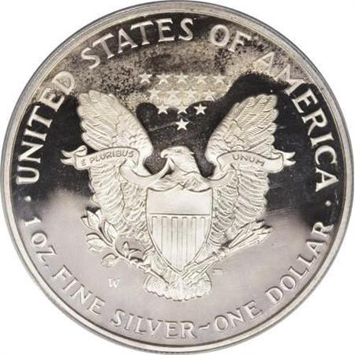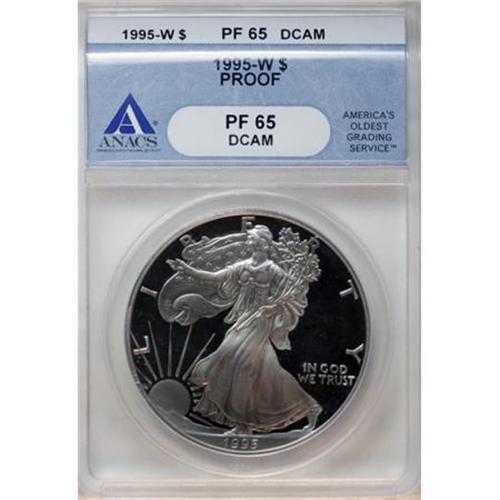 <B>1995-W $1 Silver Eagle PR65 Deep Cameo ANACS.</B></I> Fully struck with awesome deep cameo contrast on both sides. A pair of small spots in the right obverse field and some milkiness on the upper reverse prevent an even finer grade assessment. This low-mintage issue is recognized as the key date in the silver American Eagle series. <BR><BR><b>Shipping:</b> Coins & Currency (<a target="_blank" href="http://www.heritageauctions.com/common/shipping.php">view shipping information</a>)