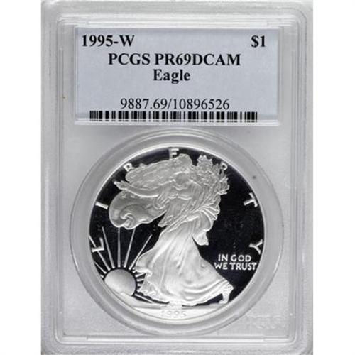 <B>1995-W $1 Silver Eagle PR69 Deep Cameo PCGS.</B></I> Outstanding white-on-black contrast ensures the exemplary eye appeal of this brilliant and flawless modern rarity. The 1995-W, with its paltry 30,125-piece mintage, remains the uncontested key to the silver American Eagle series.<BR><BR><b>Shipping:</b> Coins & Currency (<a target="_blank" href="http://www.heritageauctions.com/common/shipping.php">view shipping information</a>)