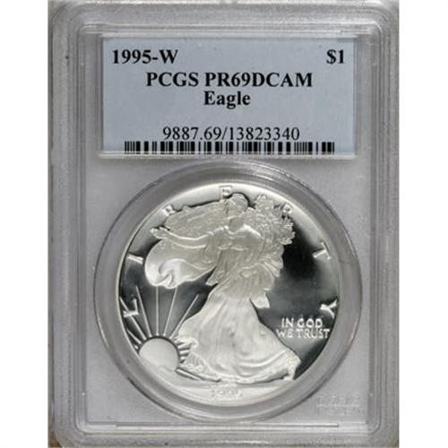 <B>1995-W $1 Silver Eagle PR69 Deep Cameo PCGS.</B></I> Yes, the 2006-P Reverse Proof also has a low mintage, but the 1995-W silver eagle remains unchallenged as the key date to the series. This needle-sharp specimen features unimprovable contrast between the frost-white devices and the seamless mirrored fields. PCGS has certified only one example finer (6/07).<BR><BR><b>Shipping:</b> Coins & Currency (<a target="_blank" href="http://www.heritageauctions.com/common/shipping.php">view shipping information</a>)