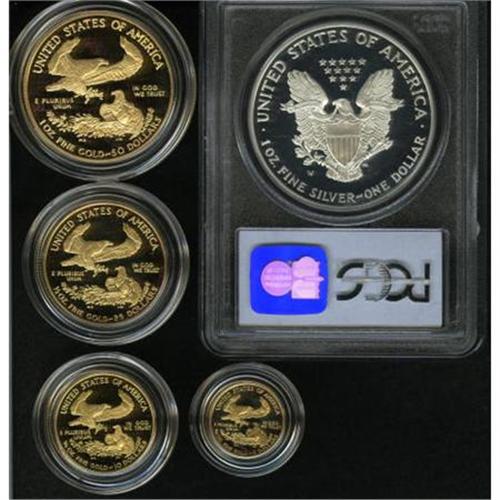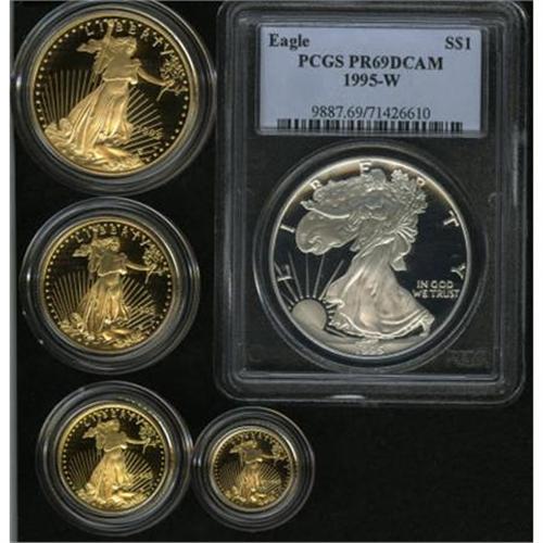<B>1995-W $1 Silver Eagle PR69 Deep Cameo PCGS With 10th Anniversary Gold Set.</B></I> The first of the proof W-mint silver American Eagle coins, and a piece that was made doubly popular in 2006 with the 2006 release of the three-piece silver American Eagle sets containing the 2006-P reverse proof, the 2006-W regular proof, and the 2006-W burnished issue. The silver 1995-W was, of course, only released in a limited mintage of 30,125 pieces to those who purchased the 10th Anniversary Set, included. The present example, graded PR69 Deep Cameo by PCGS, boasts essentially flawless, deeply cameoed surfaces. Includes the four-piece proof gold American Eagle set, each a deep cameo, flawless coin, in their original U.S. Mint packaging.<BR><BR><b>Shipping:</b> Coins & Currency (<a target="_blank" href="http://www.heritageauctions.com/common/shipping.php">view shipping information</a>)