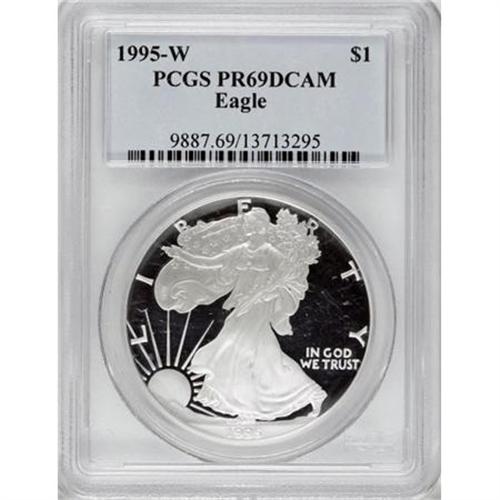 <B>1995-W $1 Silver Eagle PR69 Deep Cameo PCGS.</B></I> Both sides of this lovely silver eagle are essentially untoned, and exhibit outstanding cameo contrast. A powerful strike emboldens the design elements, and close examination reveals no marks that would bring the numerical grade into question.<BR><BR><b>Shipping:</b> Coins & Currency (<a target="_blank" href="http://www.heritageauctions.com/common/shipping.php">view shipping information</a>)