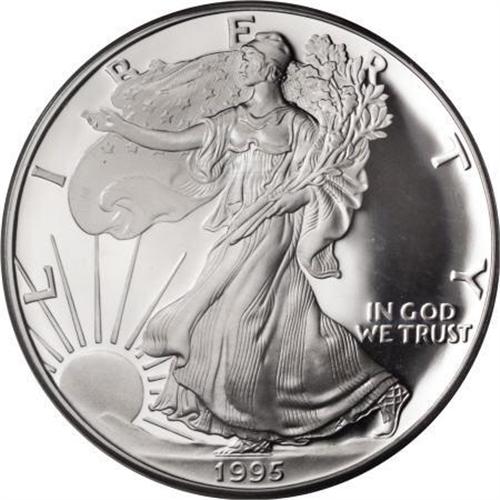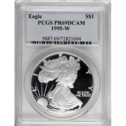 <B>1995-W $1 Silver Eagle PR69 Deep Cameo PCGS.</B></I> Outstanding white-on-black contrast invigorates this key-date silver eagle. Color free surfaces are virtually perfect, and a powerful strike yields completeness on the design elements. The mintage was limited to only 30,125 pieces, the smallest of the entire silver eagle series.<BR><BR><b>Shipping:</b> Coins & Currency (<a target="_blank" href="http://www.heritageauctions.com/common/shipping.php">view shipping information</a>)