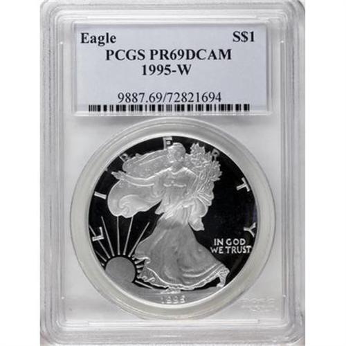<B>1995-W $1 Silver Eagle PR69 Deep Cameo PCGS.</B></I> Outstanding white-on-black contrast invigorates this key-date silver eagle. Color free surfaces are virtually perfect, and a powerful strike yields completeness on the design elements. The mintage was limited to only 30,125 pieces, the smallest of the entire silver eagle series.<BR><BR><b>Shipping:</b> Coins & Currency (<a target="_blank" href="http://www.heritageauctions.com/common/shipping.php">view shipping information</a>)