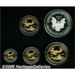 <B>1995-W 10th Anniversary American Eagle Set including the Silver Eagle.</B></I> Shunned by collectors at the time of issue, the value of the Tenth Anniversary set soared soon after it was no longer sold by the mint. The tenth-ounce, quarter-ounce, half-ounce, and one-ounce proof 1995-W gold eagles are included, however, the 1995-W<img border='0' src='http://www.heritagecoins.com/images/star.gif' width=10 height=10>$1 silver eagle is the key to a collection of proof silver eagles. All coins are essentially immaculate, aside from a hint of haze on the reverse of the quarter-ounce gold piece. The box, case, and certificate of authenticity are included. 5 coins