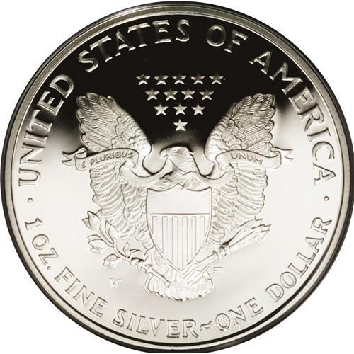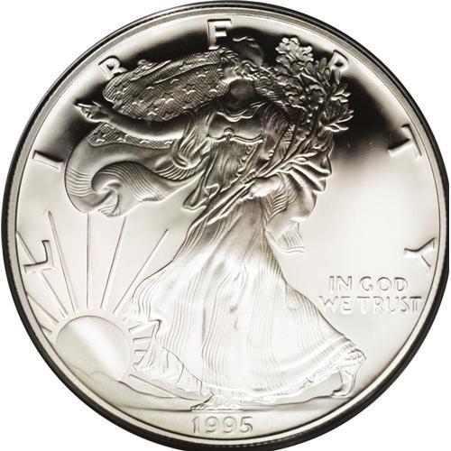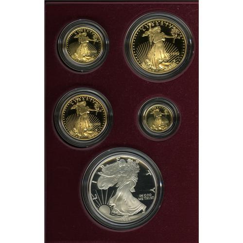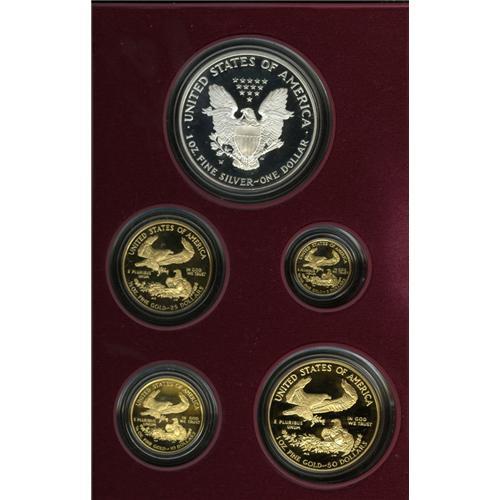 <B>1995-W American Eagle 10th Anniversary Set of Proof Bullion Coins.</B></I> Contains the runaway best-seller 1995-W proof silver eagle, as well as the proof versions of the 1995-W fifty dollar one ounce gold, twenty-five dollar one-half ounce gold, ten dollar one-quarter ounce gold, and five dollar one-tenth ounce gold. All of the coins appear to be deeply frosted cameo proofs that are essentially flawless, encased in plastic capsules. The original Mint packaging includes a hinged crimson presentation holder, marked "10th Anniversary Set," and burgundy outer box with Certificate of Authenticity.