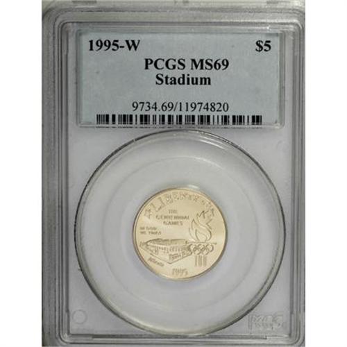 <B>1995-W G$5 Olympic/Stadium Gold Five Dollar MS69 PCGS.</B></I> . PCGS Population (684/53). NGC Census: (308/412). Numismedia Wsl. Price for NGC/PCGS coin in MS69: $800. (#9734)<BR><BR><b>Shipping:</b> Coins & Currency (<a target="_blank" href="http://www.heritageauctions.com/common/shipping.php">view shipping information</a>)