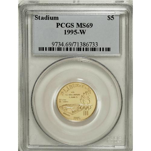 <B>1995-W G$5 Olympic/Stadium Gold Five Dollar MS69 PCGS.</B></I> PCGS Population (438/45). NGC Census: (292/388). Numismedia Wsl. Price for NGC/PCGS coin in MS69: $900. (#9734)<BR><BR><b>Shipping:</b> Coins & Currency (<a target="_blank" href="http://www.heritageauctions.com/common/shipping.php">view shipping information</a>)