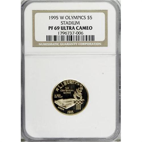 <B>1995-W G$5 Olympic/Stadium Gold Five Dollar PR69 Deep Cameo NGC.</B></I> NGC Census: (13/0). PCGS Population (716/27). Numismedia Wsl. Price for NGC/PCGS coin in PR69: $350. (#9735)<BR><BR><b>Shipping:</b> Coins & Currency (<a target="_blank" href="http://www.heritageauctions.com/common/shipping.php">view shipping information</a>)