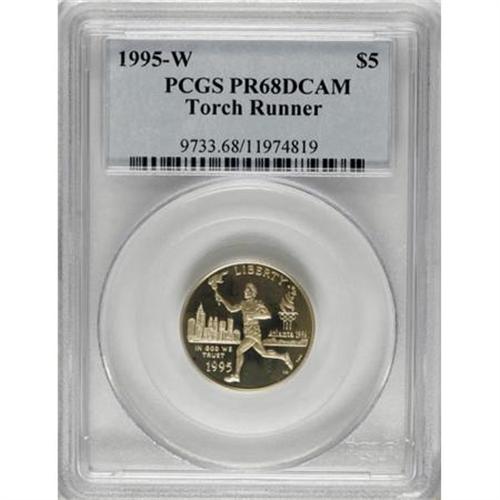 <B>1995-W G$5 Olympic/Torch Runner Gold Five Dollar PR68 Deep Cameo PCGS.</B></I> . PCGS Population (39/1251). NGC Census: (0/13). Numismedia Wsl. Price for NGC/PCGS coin in PR68: $242. (#9733)<BR><BR><b>Shipping:</b> Coins & Currency (<a target="_blank" href="http://www.heritageauctions.com/common/shipping.php">view shipping information</a>)